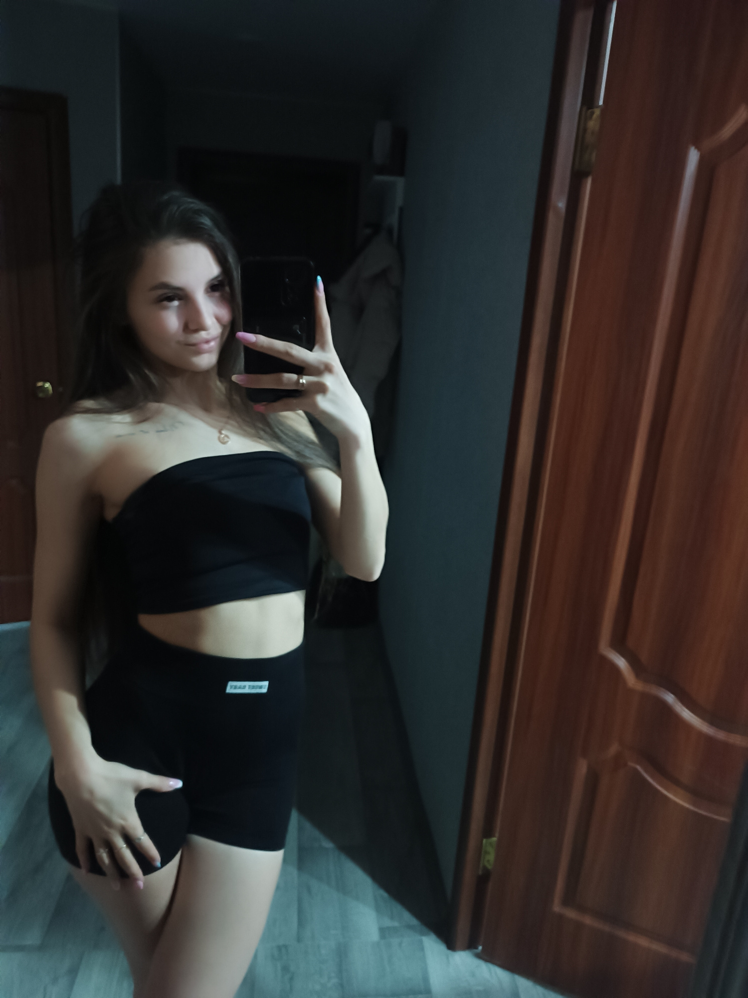 A young woman with long brown hair is taking a selfie in what appears to be an apartment. She is wearing a black strapless top and black shorts. Her left hand is on her hip. In the background are two…read more