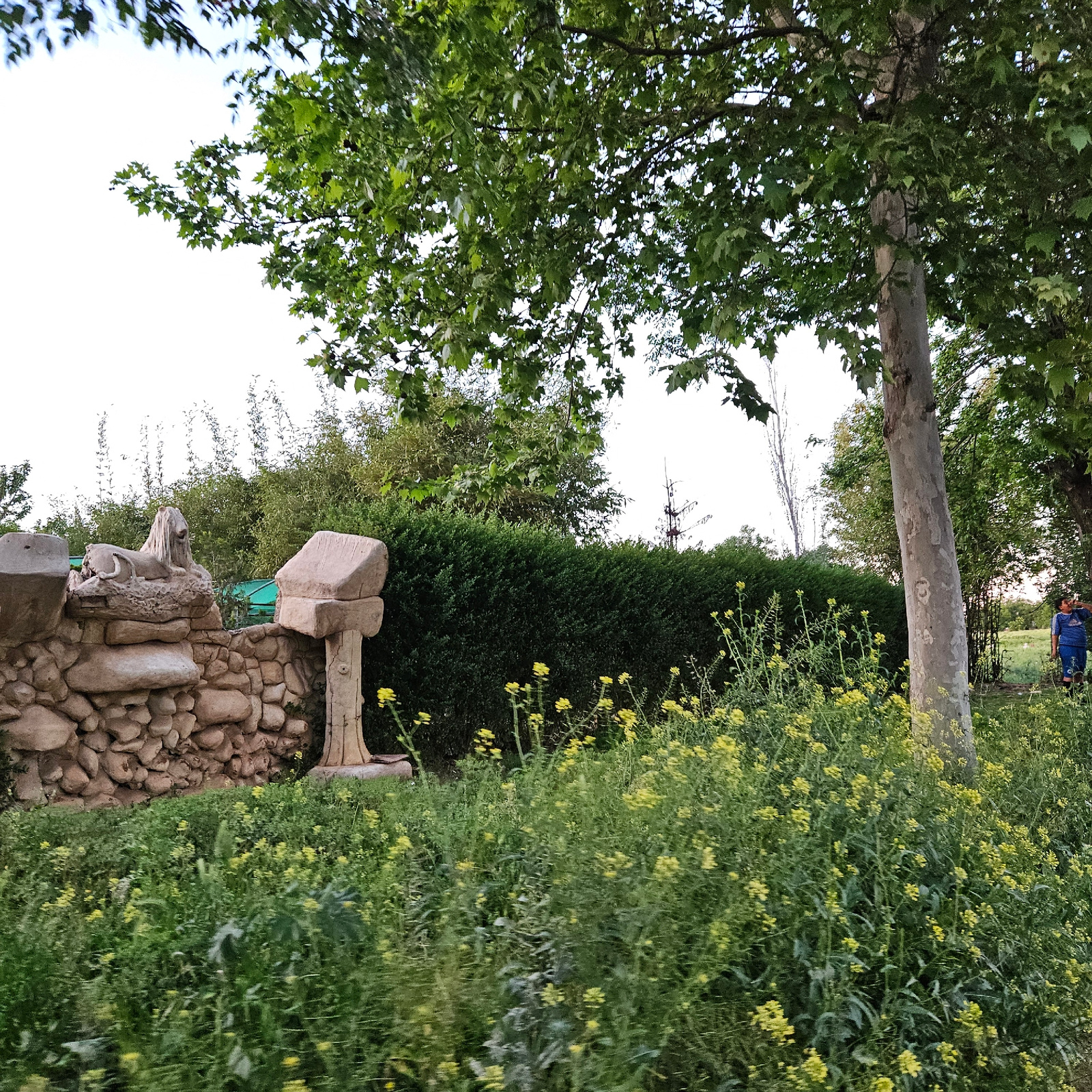 A vertical, outdoor shot depicts a stone fountain surrounded by lush green vegetation and yellow flowers, set against a backdrop of trees and foliage. The fountain appears to be made of irregularly sh…read more