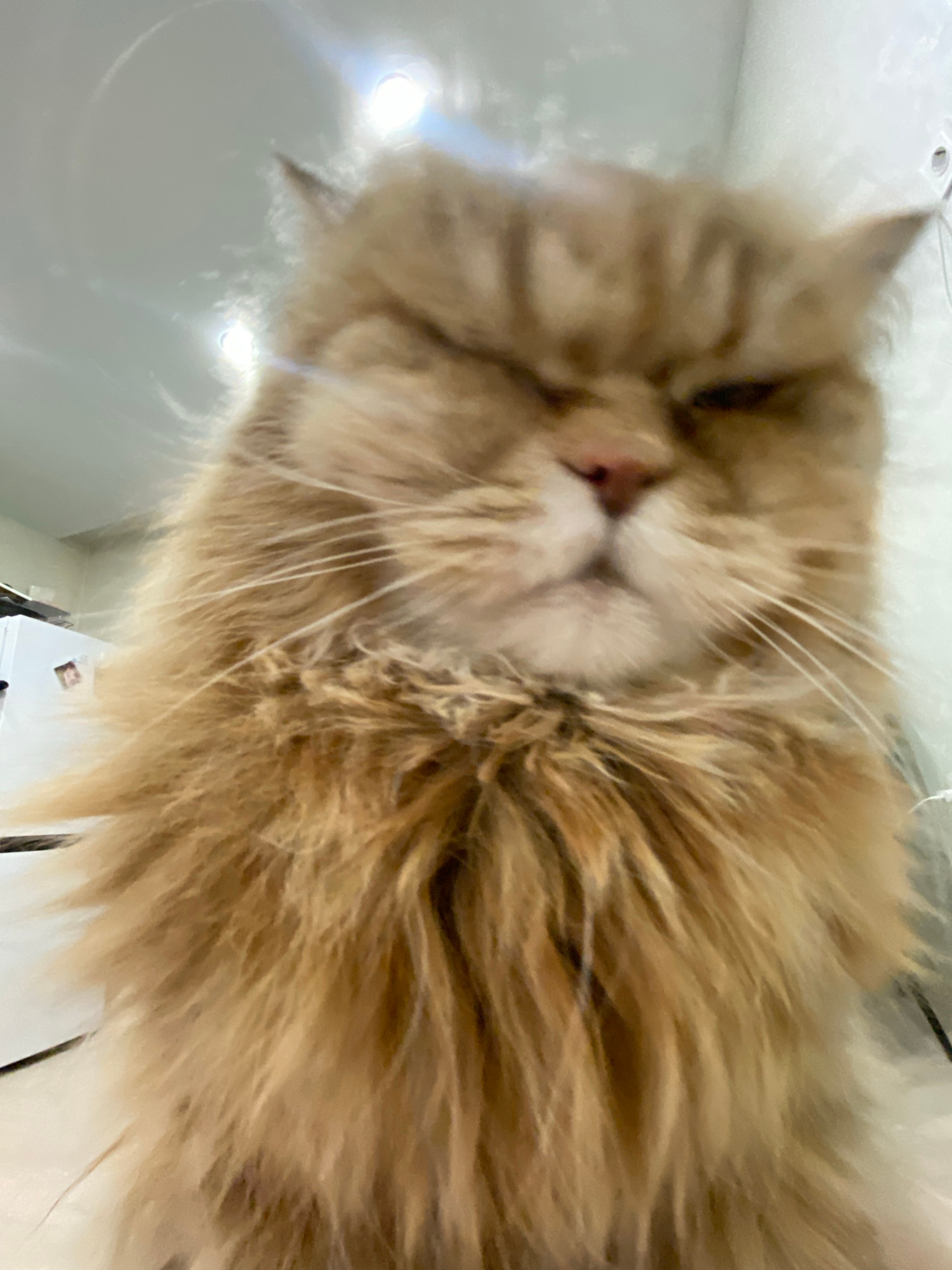 The image shows a close-up of a light orange, long-haired cat. The cat's face is the central focus, with its eyes mostly closed. Its pink nose and whiskers are visible. The background includes a white…read more
