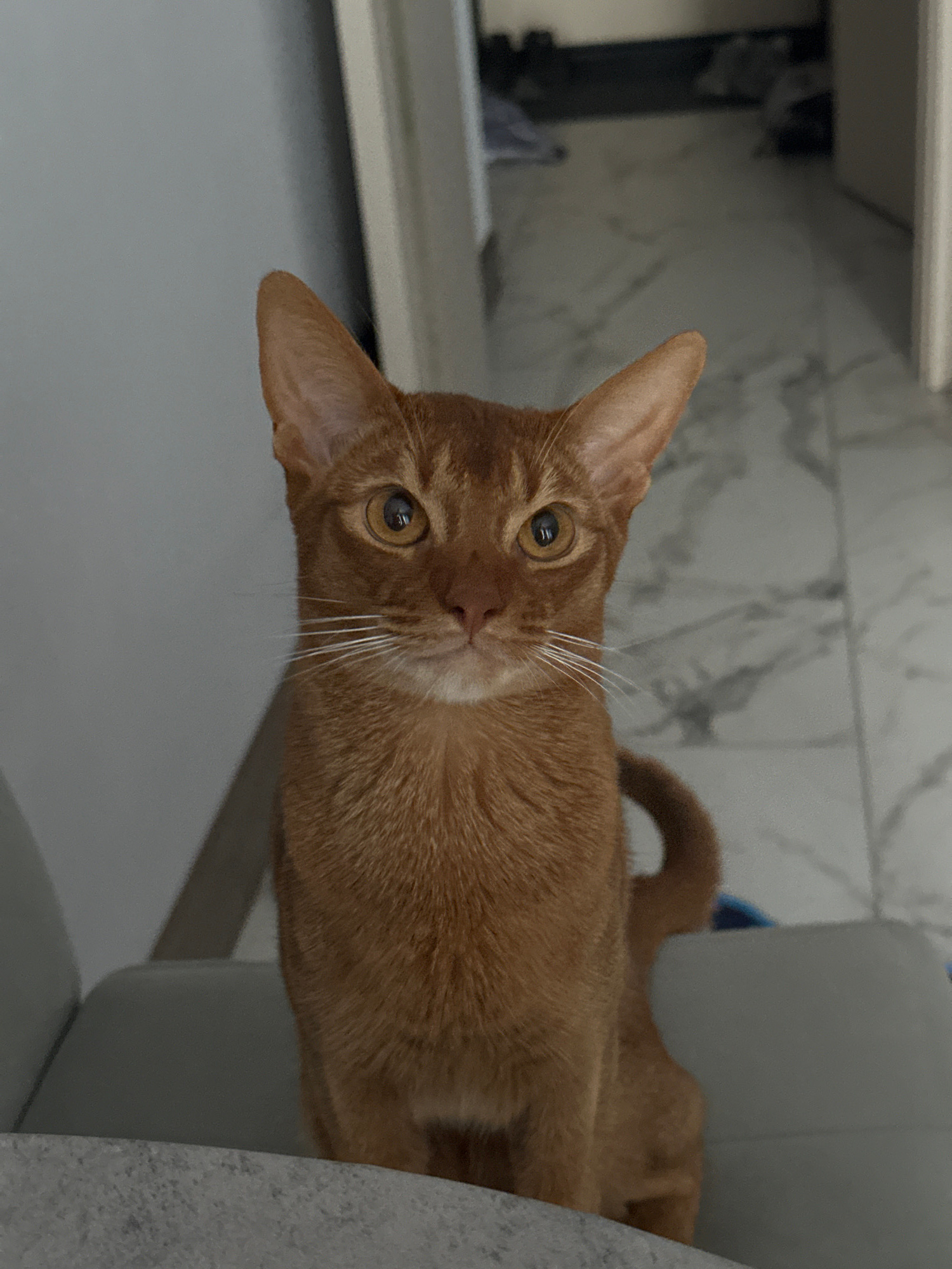 A close-up shot features an orange cat with amber eyes and a curved tail resting on a light gray chair. The cat's head is tilted towards the camera. The background consists of a gray and white pattern…read more