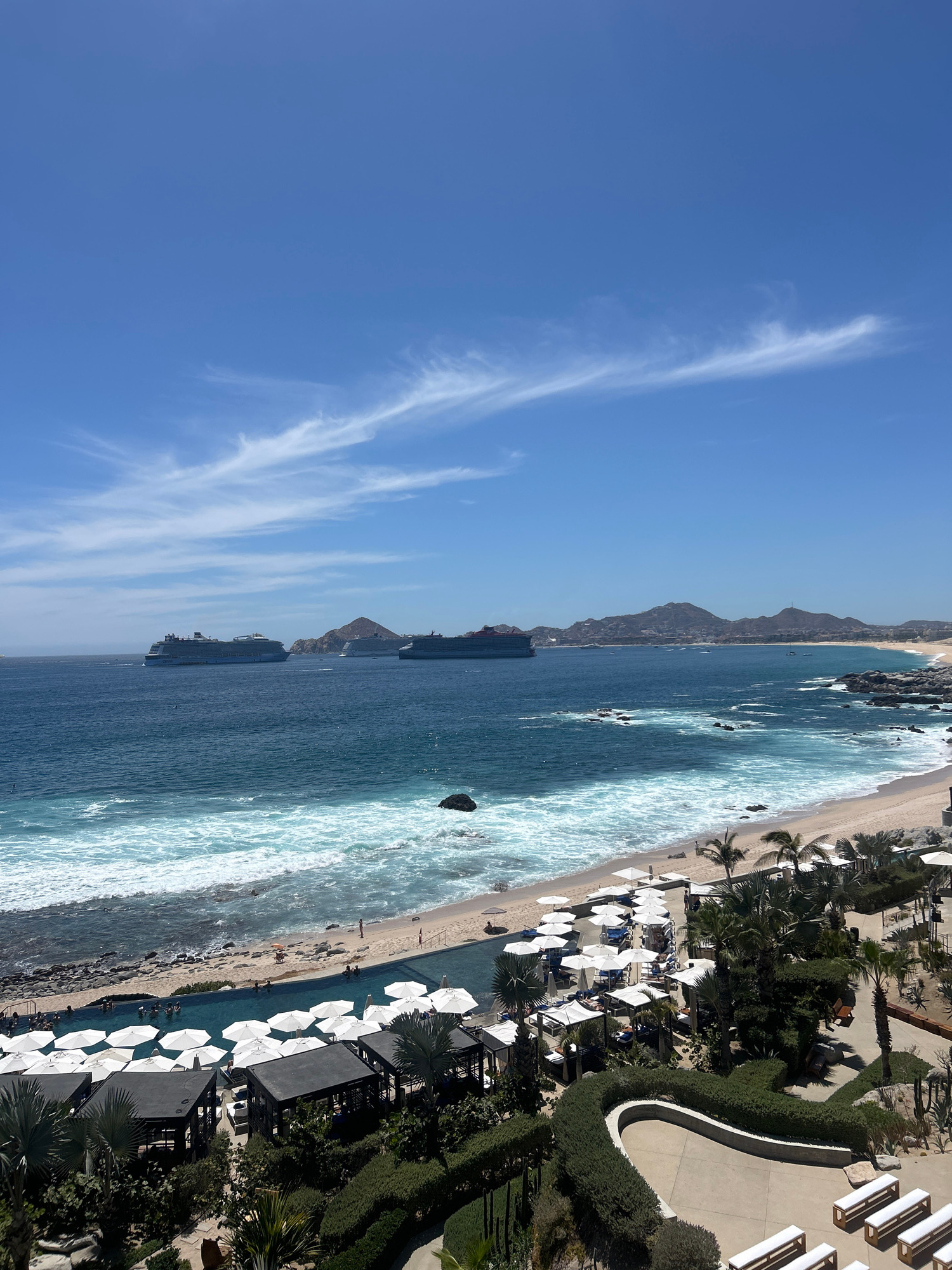 The image shows a beach in Cabo San Lucas, Mexico, with a blue sky containing several wispy clouds. The ocean is turquoise, and the waves are visible. The beach has white sand, and there are people on…read more