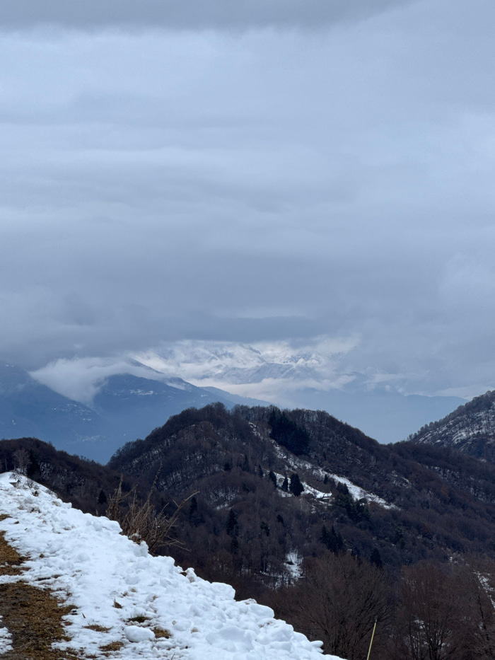 A mountainous landscape under an overcast sky. A dark, tree-covered mountainside descends to a lower altitude, partially obscured by clouds. Patches of snow cling to the mountainside and foreground. D…read more