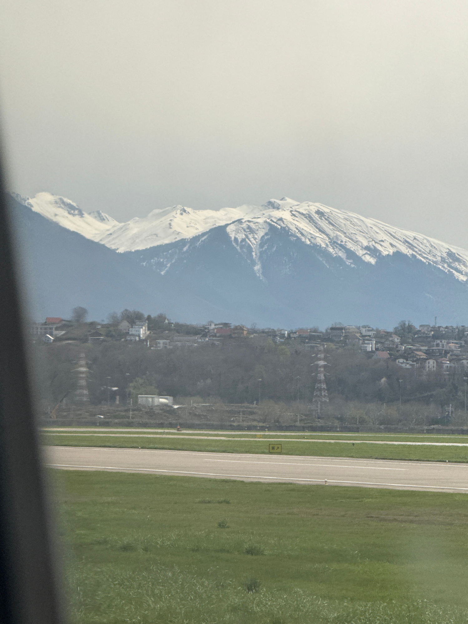 From a high vantage point, possibly an airplane window, the image depicts a view of Sochi, Russia. A snow-capped mountain dominates the left side of the frame, contrasting with the city below. A resid…read more