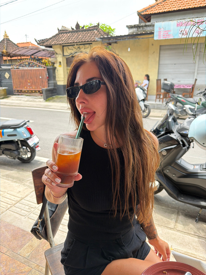 A young woman with long brown hair is seated at an outdoor table, wearing sunglasses, a black top, and black shorts. She holds a textured glass filled with a dark liquid and a green straw, sticking he…read more