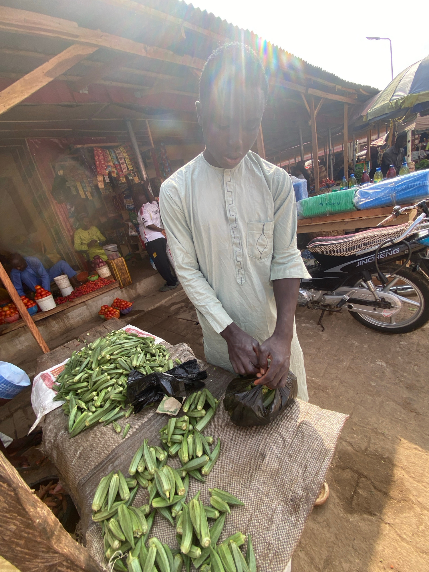 This image captures a vibrant, sunlit scene at an outdoor market in Kafanchan B, Nigeria. The central figure is a man, likely a vendor, wearing a light-colored, long-sleeved garment. He is focused onβ¦read more