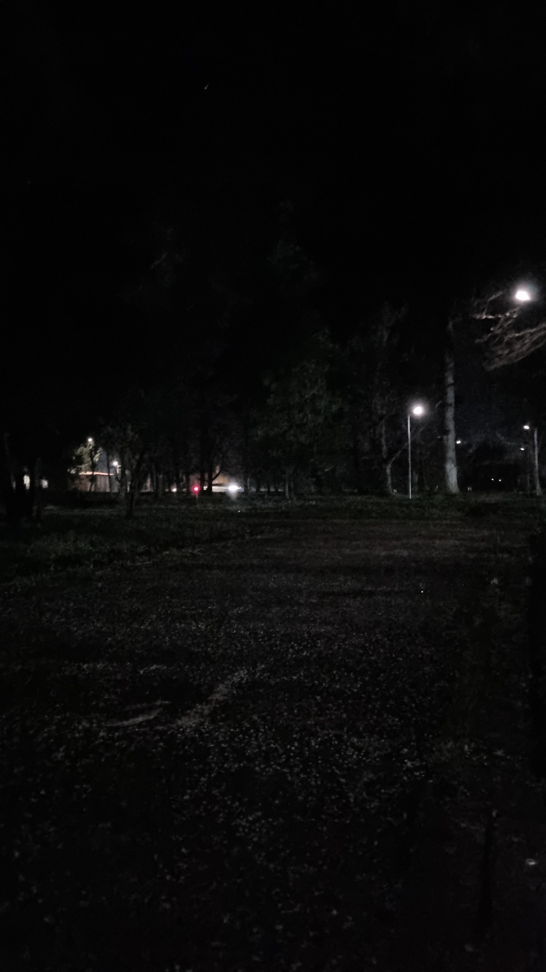 A dimly lit, slightly angled nighttime scene. The right portion of the image shows a dark, textured surface, potentially a ground path. Along the center, there are trees, appearing as silhouettes, and…read more