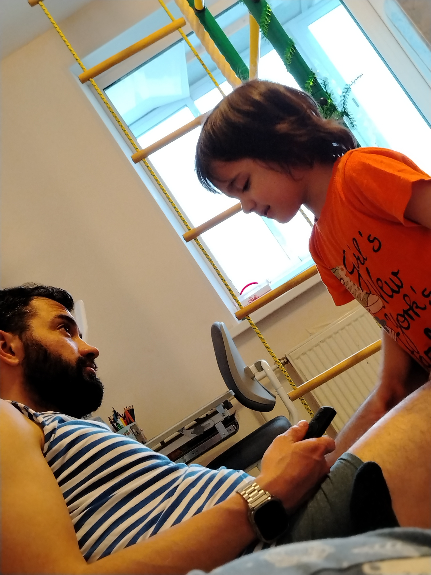 A medium shot captures a bearded man in a blue and white striped tank top reclining with a smartwatch on his left wrist and a black remote in his right hand, looking up at a young child wearing an oraβ¦read more