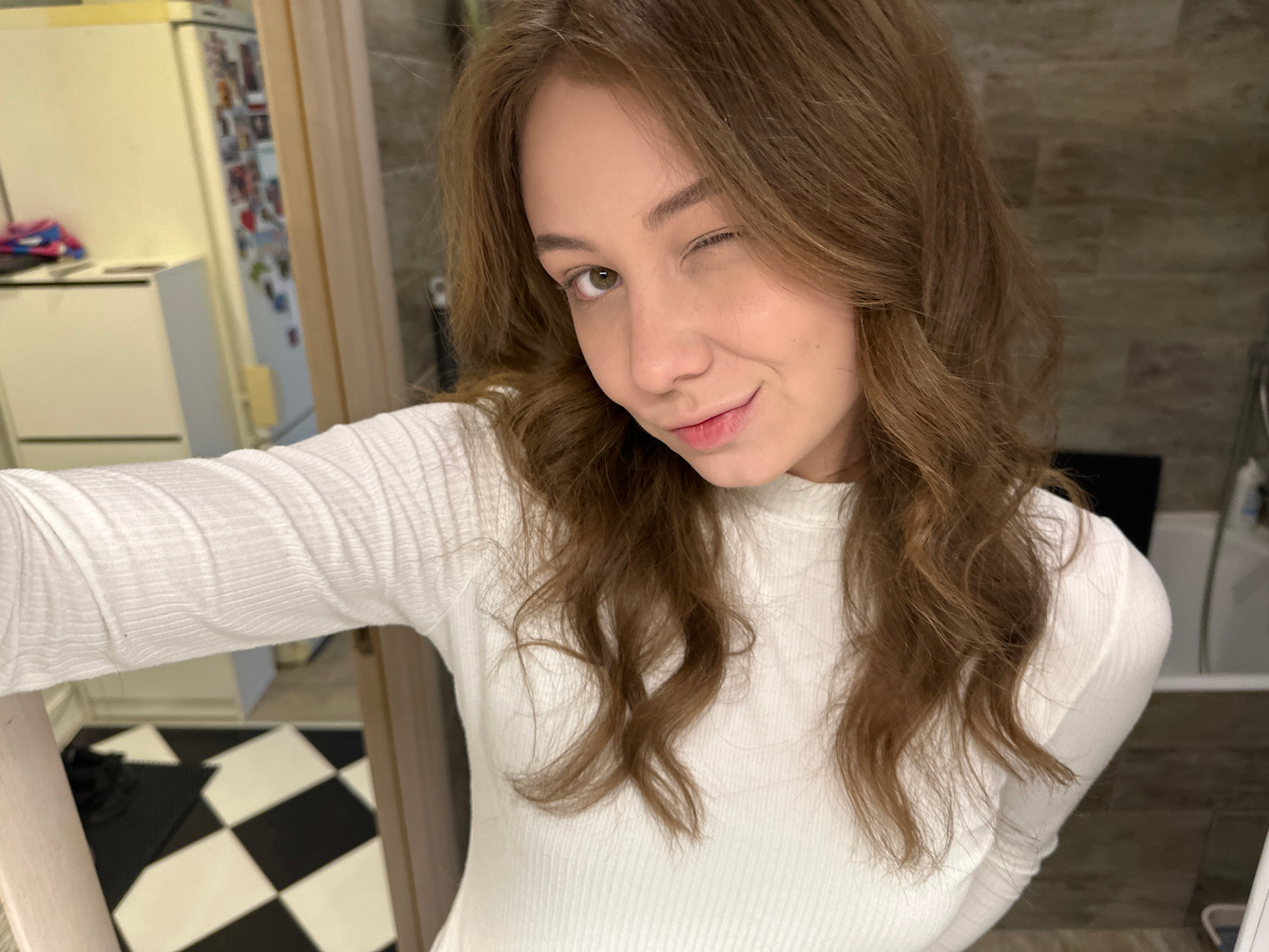 A woman with brown hair is taking a selfie indoors. She's wearing a white, long-sleeved shirt. The background shows part of a kitchen with a black and white checkered floor, cabinets, and appliances.…read more