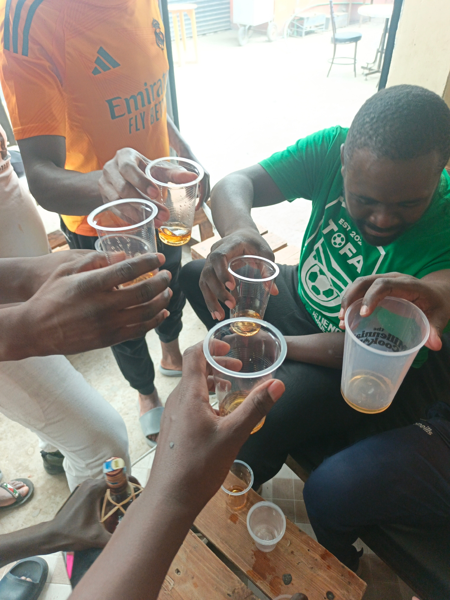 A group of people are gathered around a low wooden table in what appears to be a casual outdoor setting, possibly a patio or veranda. Several individuals are raising clear plastic cups filled with a l…read more