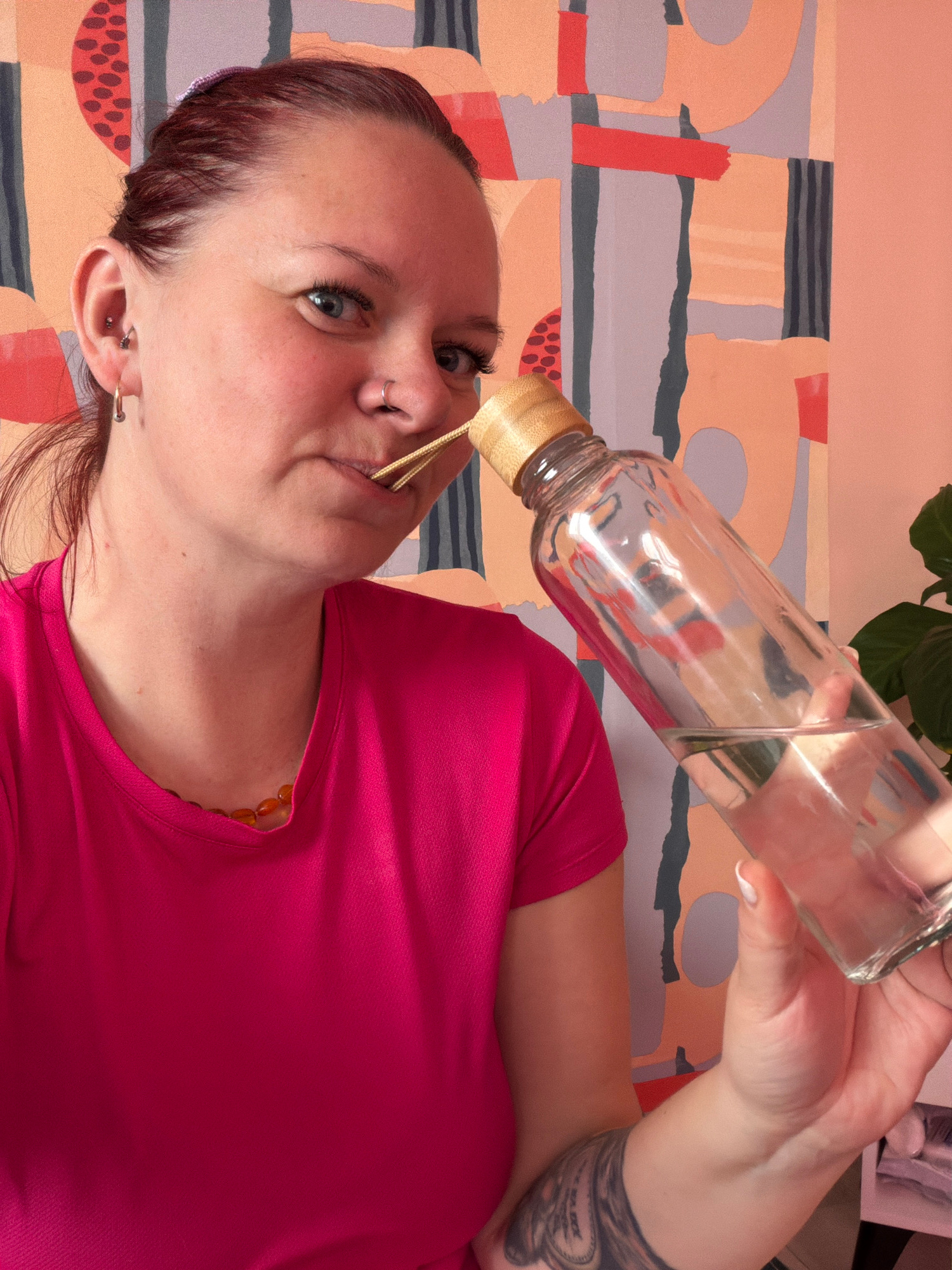 A woman with fair skin, blue eyes, and dark red hair is tilted to the left and looks upward. She is wearing a pink t-shirt and a beaded necklace. Her right arm is raised, holding a glass bottle with a…read more