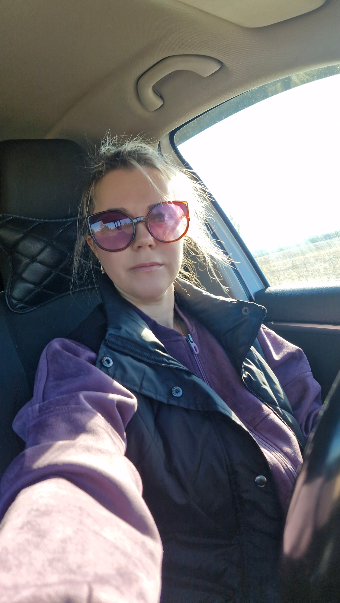 The media file presents a close-up, slightly tilted view of a person inside a car during daytime. The primary subject is a person, likely female, with blonde hair styled with wispy strands, wearing ov…read more