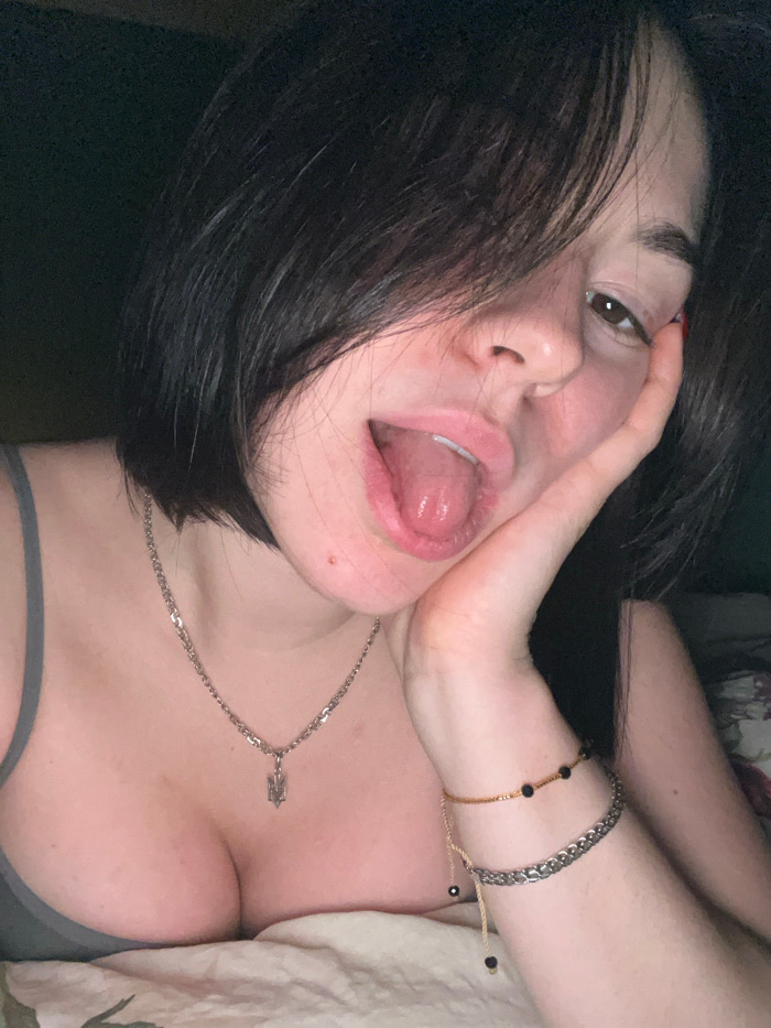 This close-up, angled selfie portrays a young woman indoors, likely in Odesa, Ukraine. She is depicted lying down, possibly on a bed or couch, with a neutral-toned fabric visible to her right. The su…read more