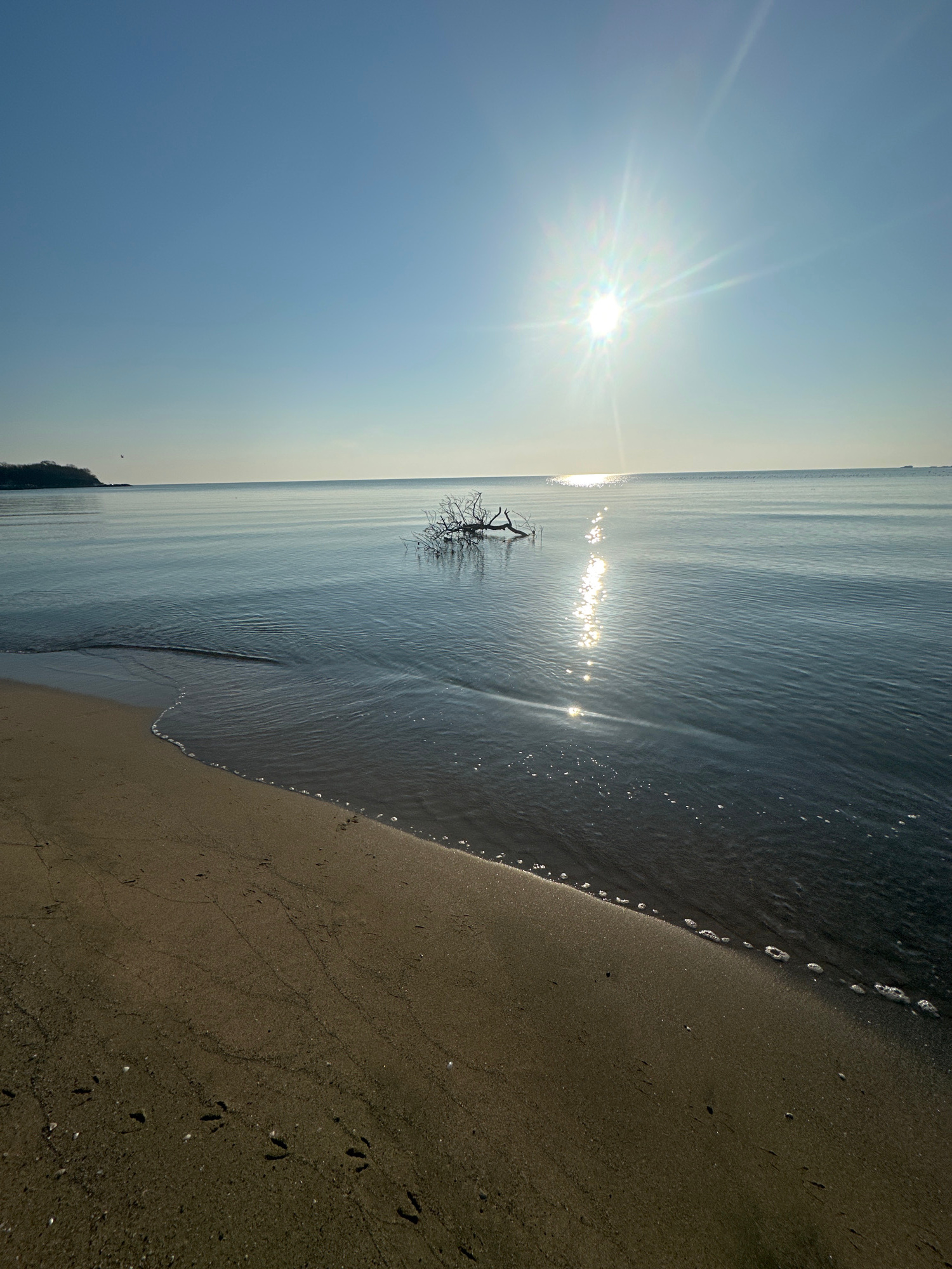 The image depicts a seaside scene, likely a beach, on a sunny day. The sun is positioned in the upper left corner of the frame, creating a bright glare on the water's surface. The water is calm, with…read more