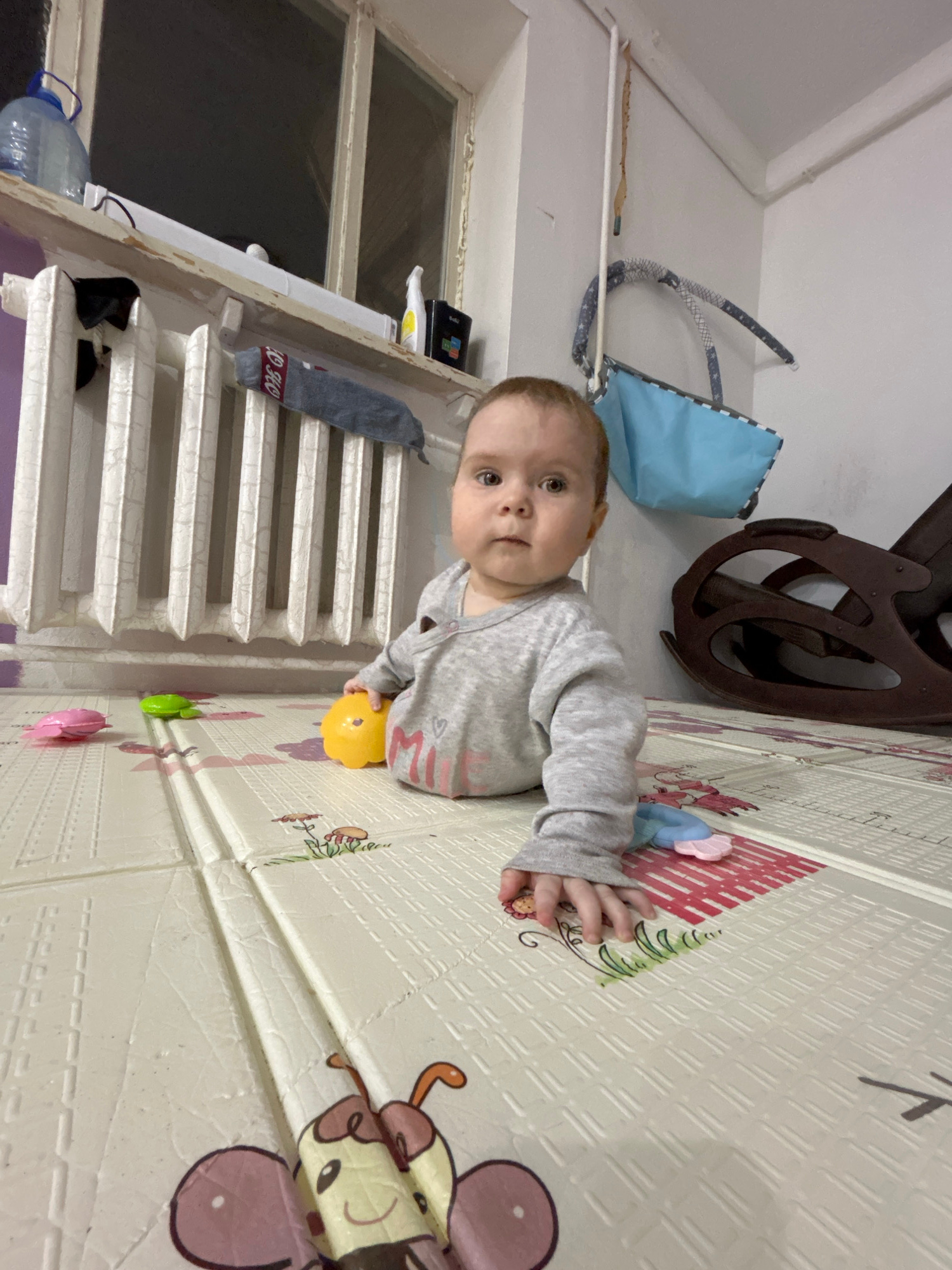 A baby wearing a gray shirt is lying on a white play mat with colorful cartoon animal designs. The baby is holding a yellow ball toy. Behind the baby is a white radiator, and near the radiator is a wi…read more