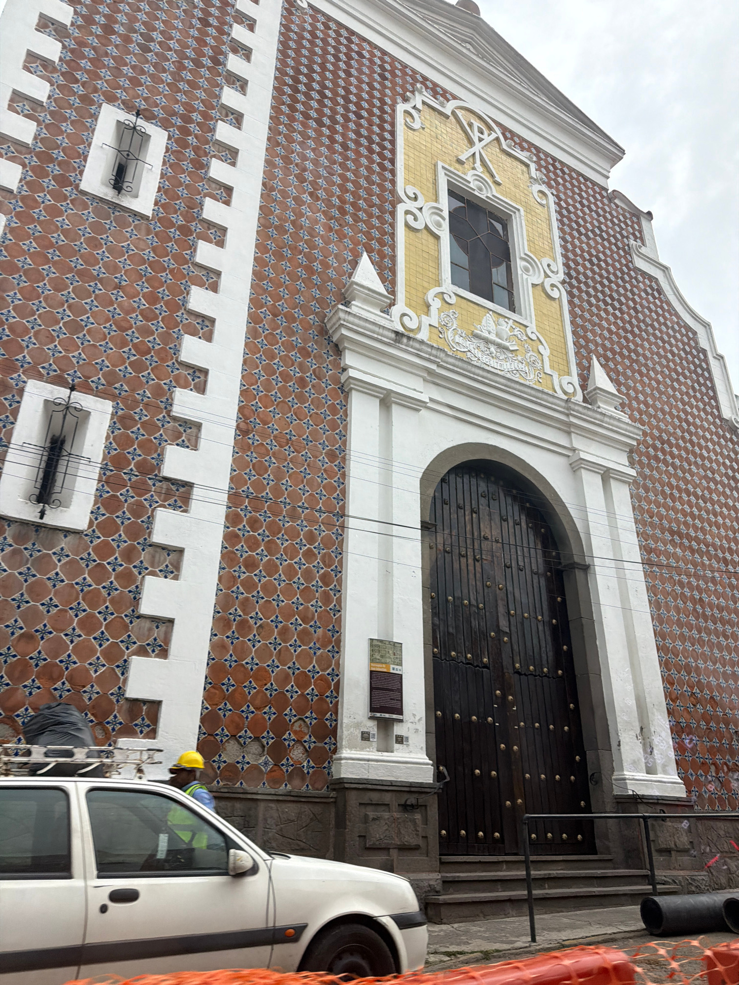 The image depicts a portion of the facade of a building in Puebla, Mexico, characterized by its unique architecture. The building features brown and blue patterned tiles across its surface, punctuated…read more