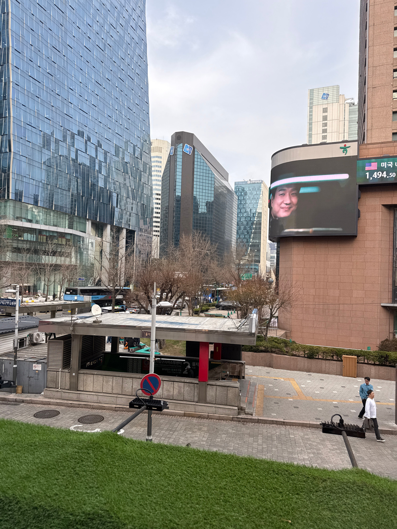The image captures an urban streetscape in Seoul, South Korea, specifically in the Euljiro district, identifiable by the "을지" (Eulji) and "을지로 지하상가" (Euljiro Underground Shopping Center) signage on the subway entrance. The foreground features a grassy embankment descending to a paved pedestrian area. A circular "no parking/stopping" sign is visible on the walkway, next to a metallic, possibly damaged, pole with a rake-like top lying angled across the pavement and grass. Two adult males are observed walking away from the camera on the pedestrian path in the lower right. One wears a white long-sleeve shirt and dark trousers, the other a light blue long-sleeve shirt and dark trousers. A concrete structure housing a subway entrance is centrally located, with stairs leading underground. Beyond this, a multi-lane roadway is visible, occupied by a blue city bus and other vehicles. Bare trees with no foliage are dispersed throughout the midground. The background is dominated by multiple tall buildings under an overcast sky. A large, modern skyscraper with a reflective glass facade occupies the left side of the frame. To the right, a brick-colored building features a large, curved LED screen displaying the smiling face of an Asian male, an American flag, Korean text ("미국 나"), and the numerical value "1,494.50". Above the screen, a green logo resembling a stylized figure or tree is present. Other distant high-rise buildings are visible, including one with the "IBK" logo and another with "신한라이프" (Shinhan Life) branding. The overall scene depicts a busy commercial or financial district. | Open Wire