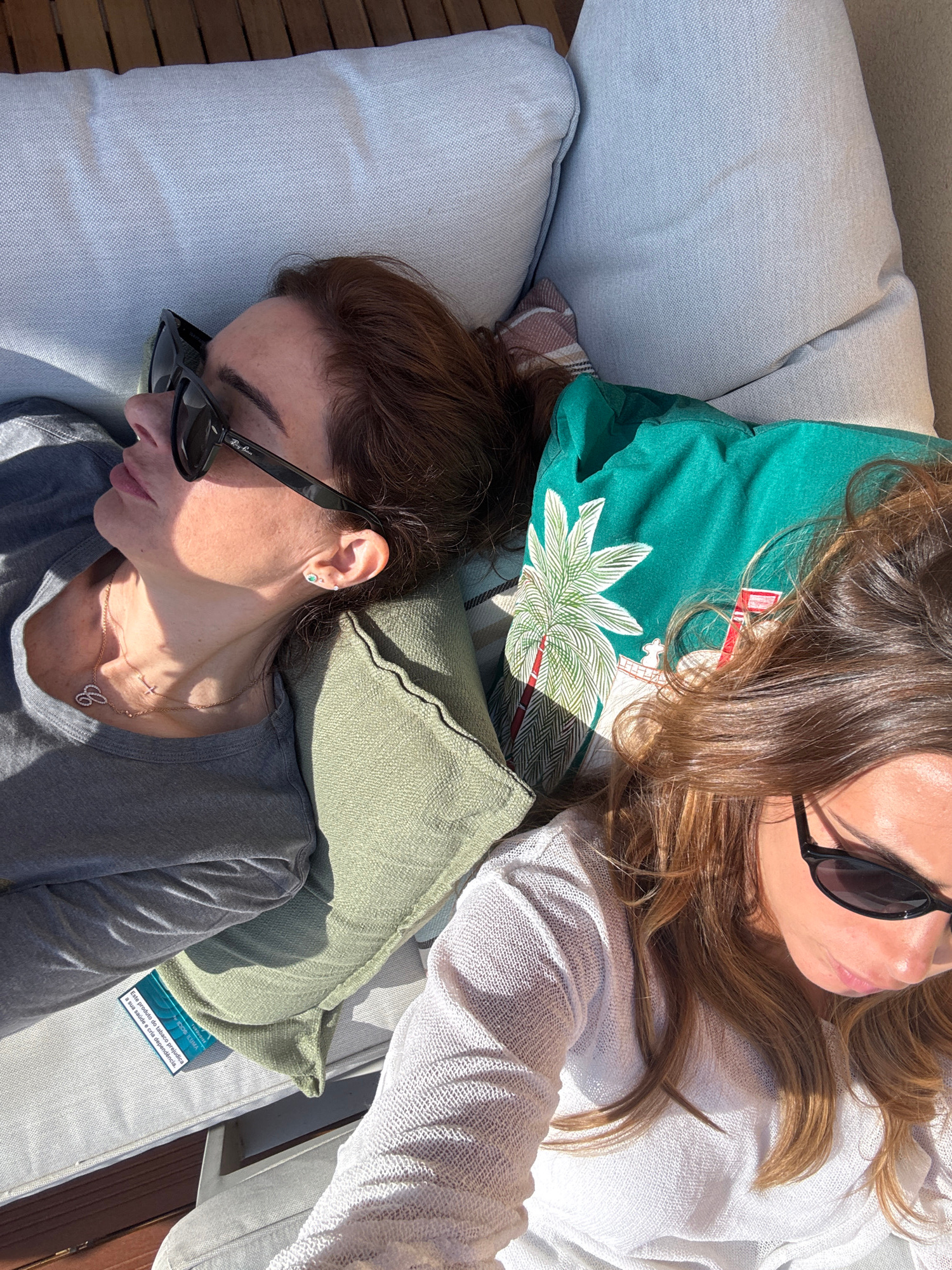 The image is an overhead shot of two women lounging on a light grey outdoor couch. One woman, wearing sunglasses and a light-colored sweater, rests her head on a green pillow printed with a tropical d…read more