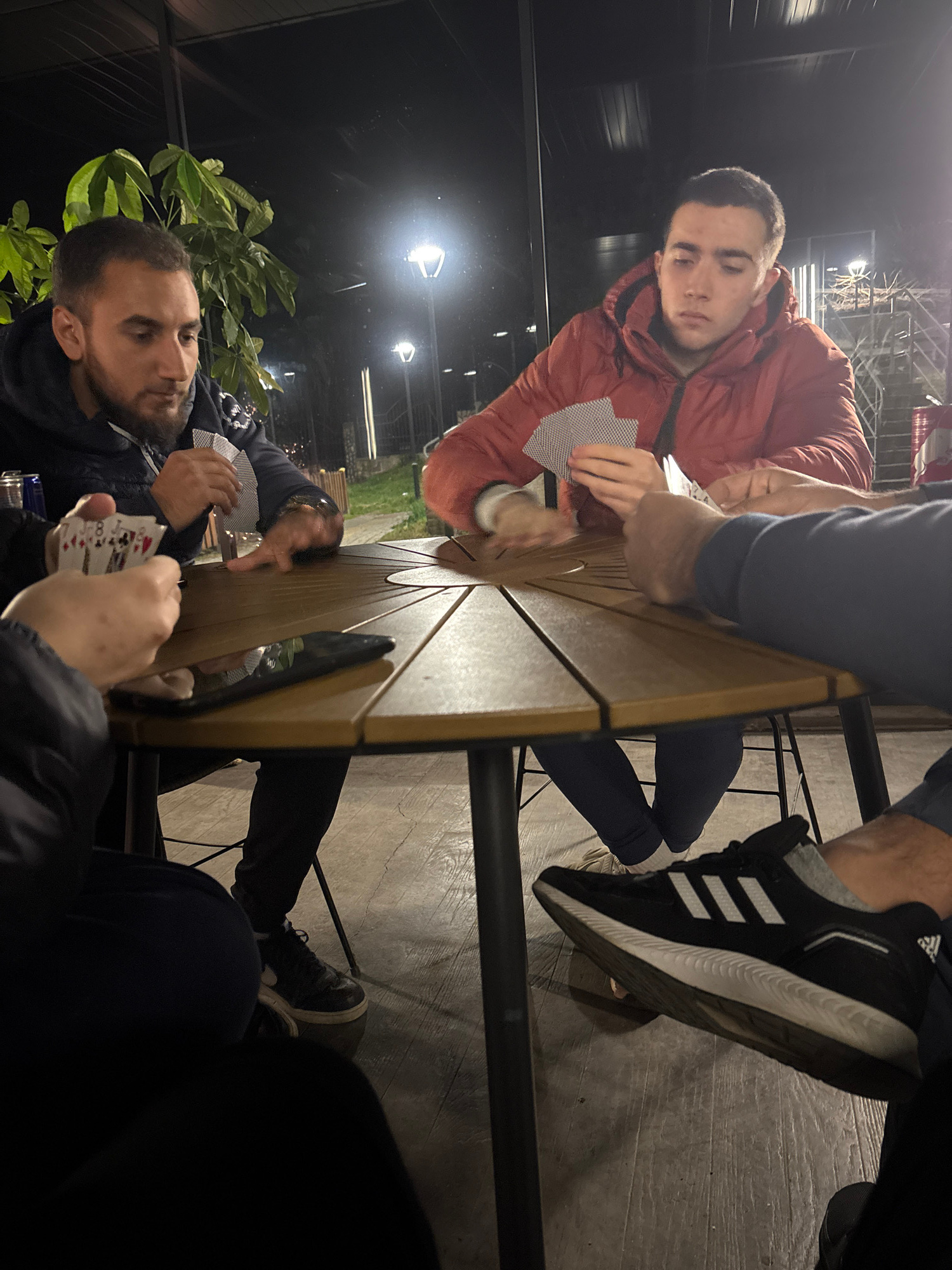 Four people are playing cards at a round wooden table. One person is wearing a red jacket. One person has black Adidas sneakers. The location appears to be outdoors, possibly a patio or deck at night.…read more