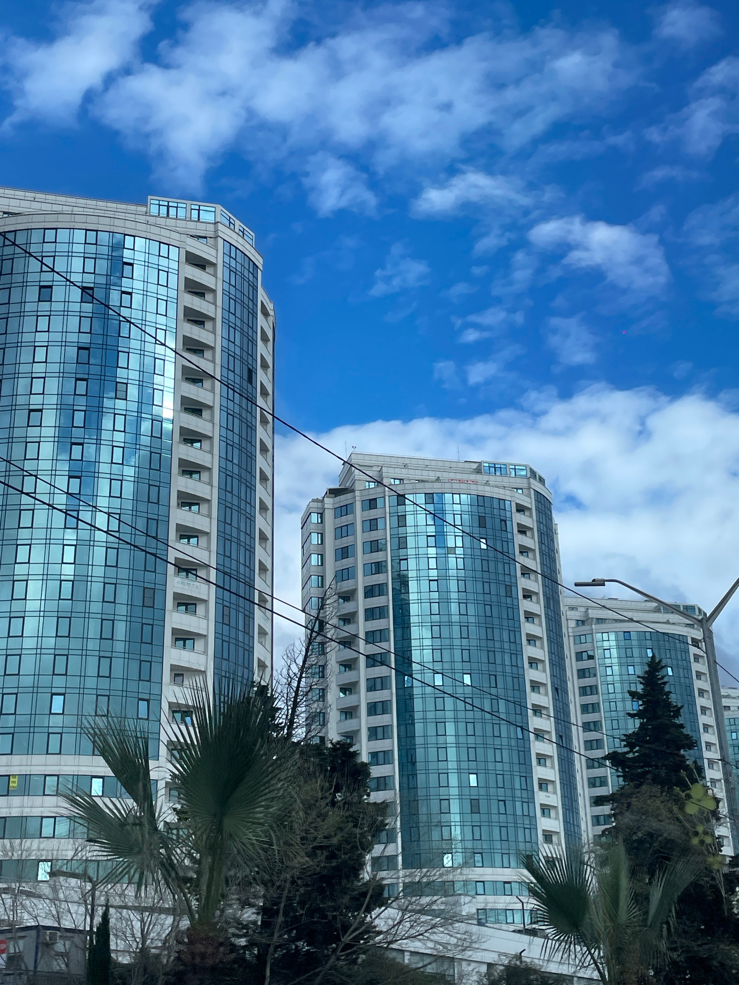 The image depicts a low-angle view of two modern high-rise buildings in Sochi, Russia. The buildings feature a grid-like facade of reflective glass windows and white stone or concrete framing. Wires,…read more