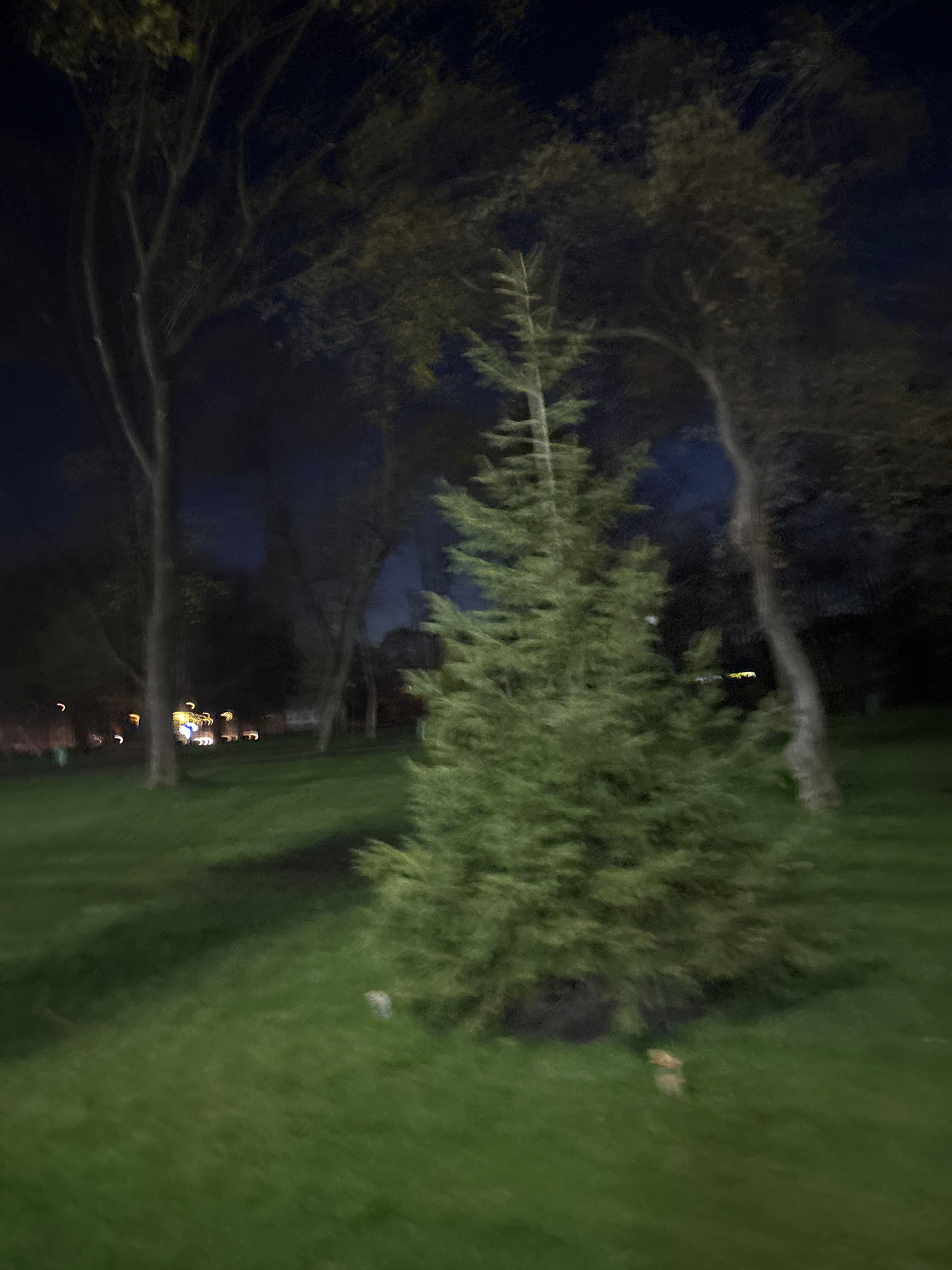 The image depicts a nighttime scene in what appears to be a park or green space. A large tree is present with branches extending across the frame. To the right is an area of green grass or lawn. In th…read more