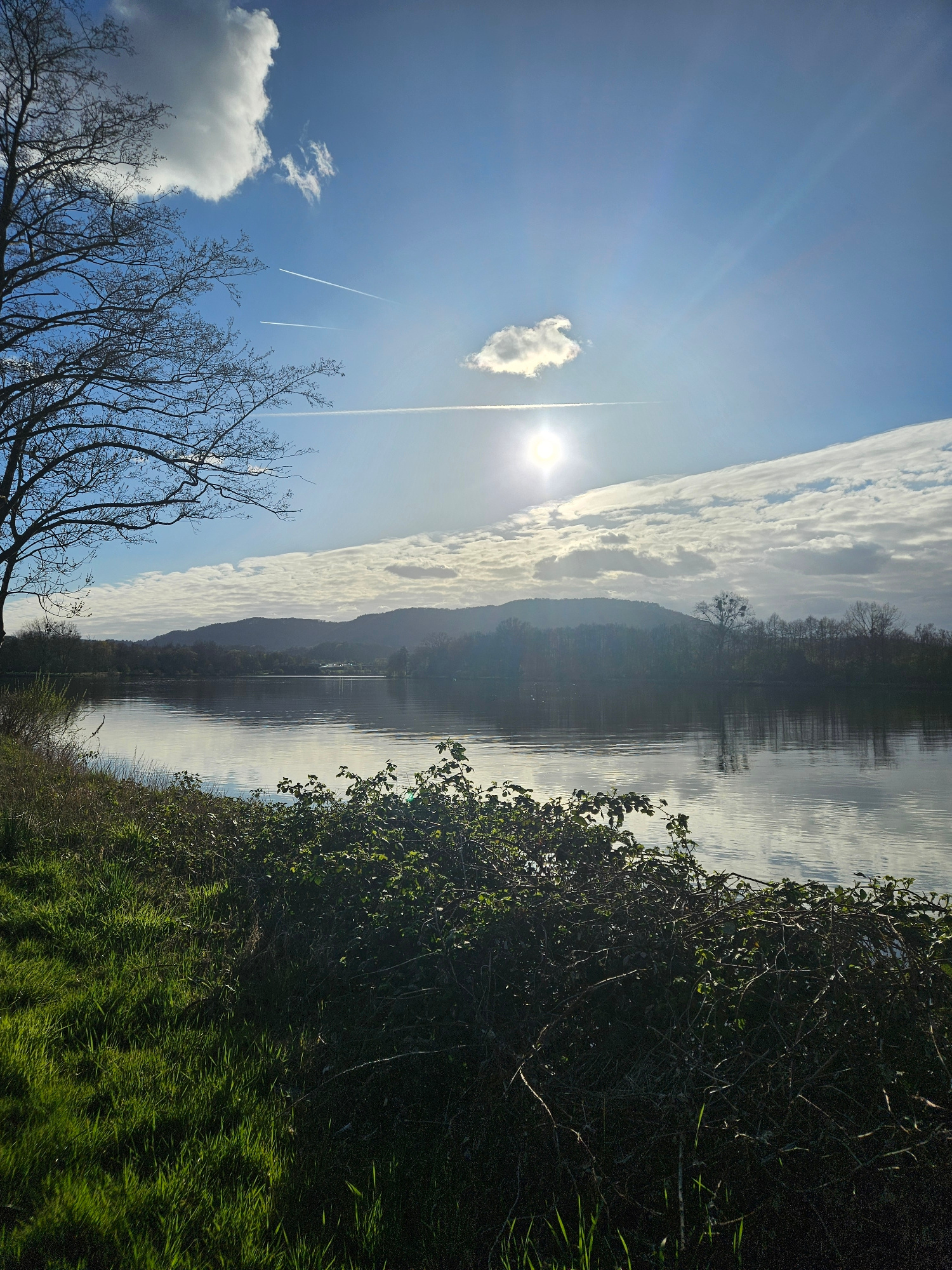 This image depicts a wide body of water, likely a river, under a bright sky in Konz, Germany. The scene is presented from a low vantage point on the bank, with the sun positioned in the upper right qu…read more