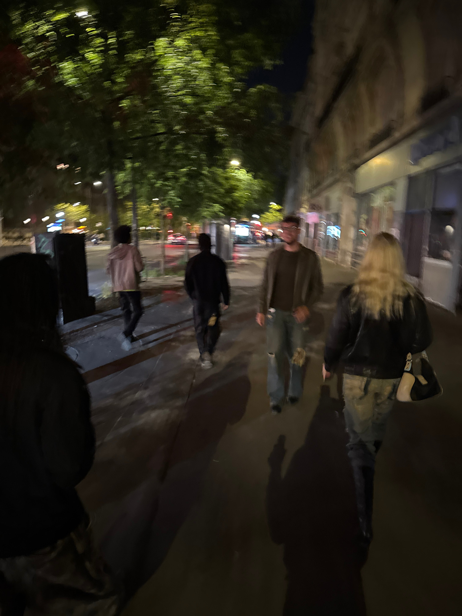 A blurred, low-angle shot depicts a nighttime urban scene, likely in Paris, France, suggested by the architectural styles and lighting. Four pedestrians are visible on a dimly lit sidewalk, their imag…read more