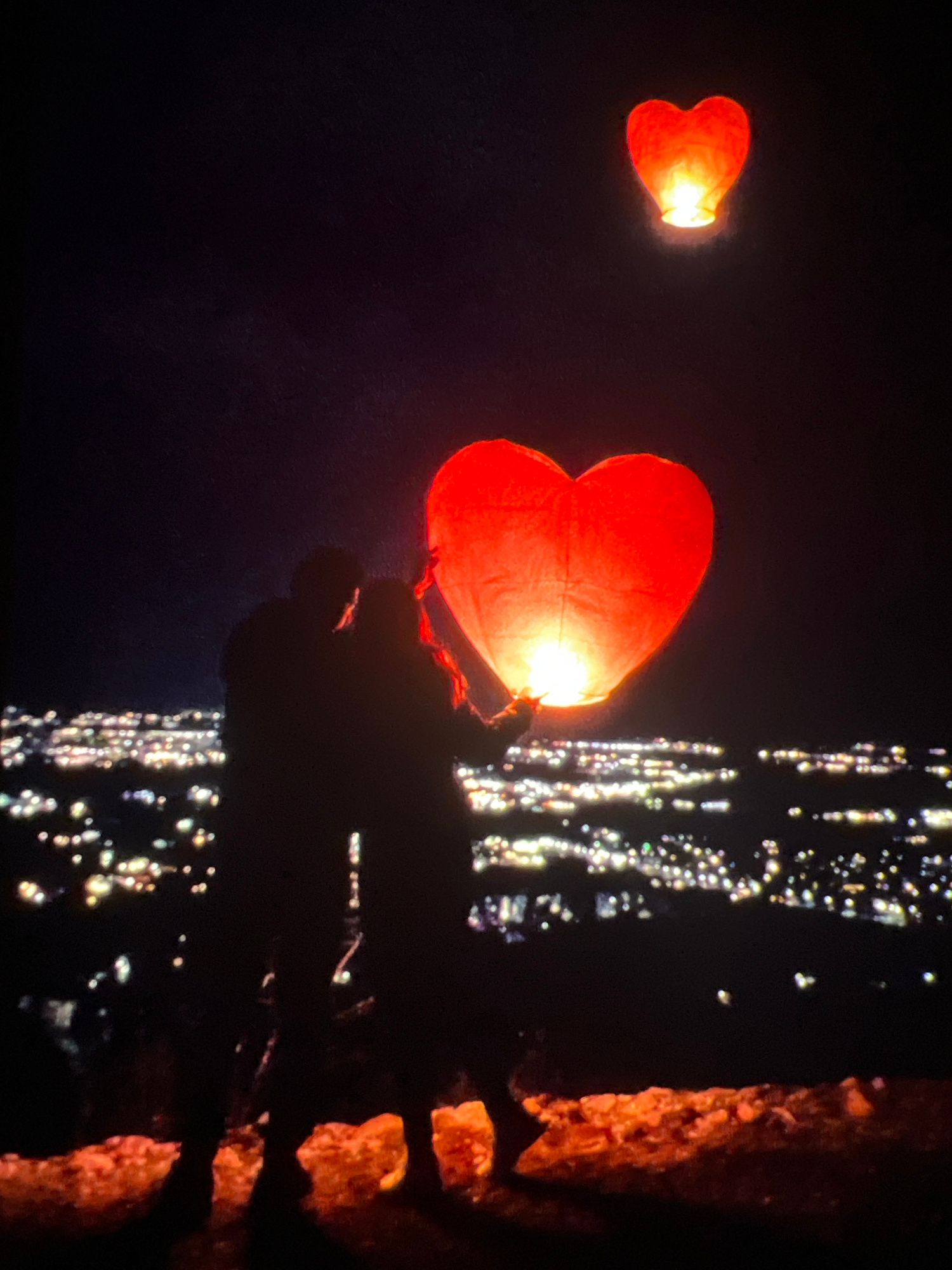 The media file presents a nighttime scene, likely taken from an elevated vantage point overlooking a town or city in Markovo, Bulgaria. The primary subjects are two bright red, heart-shaped sky lante…read more