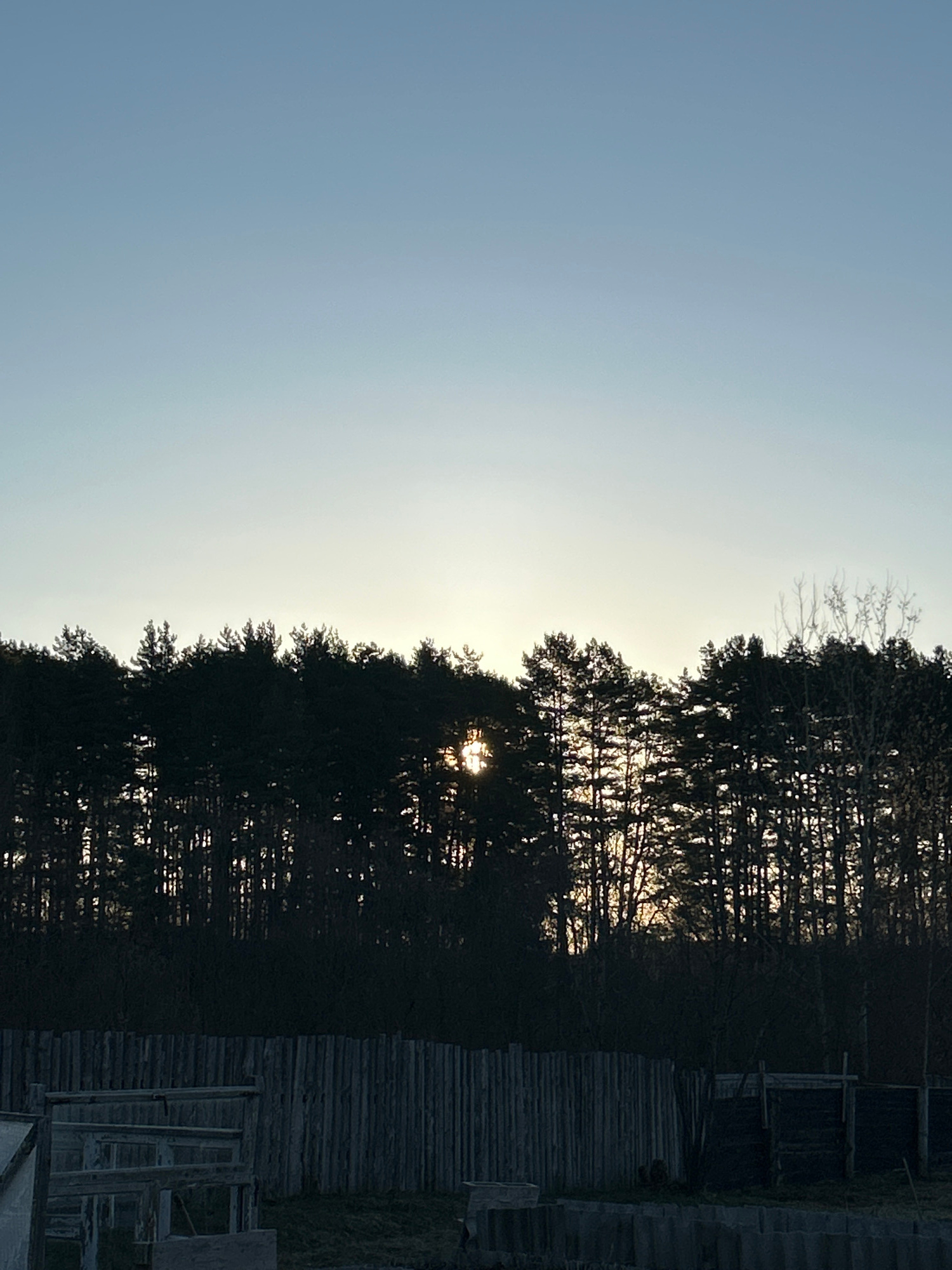 The image depicts a silhouetted treeline against a pale, brightening sky, likely at sunrise or sunset. The treeline stretches horizontally across the frame, dividing the sky above from a darker, moreβ¦read more