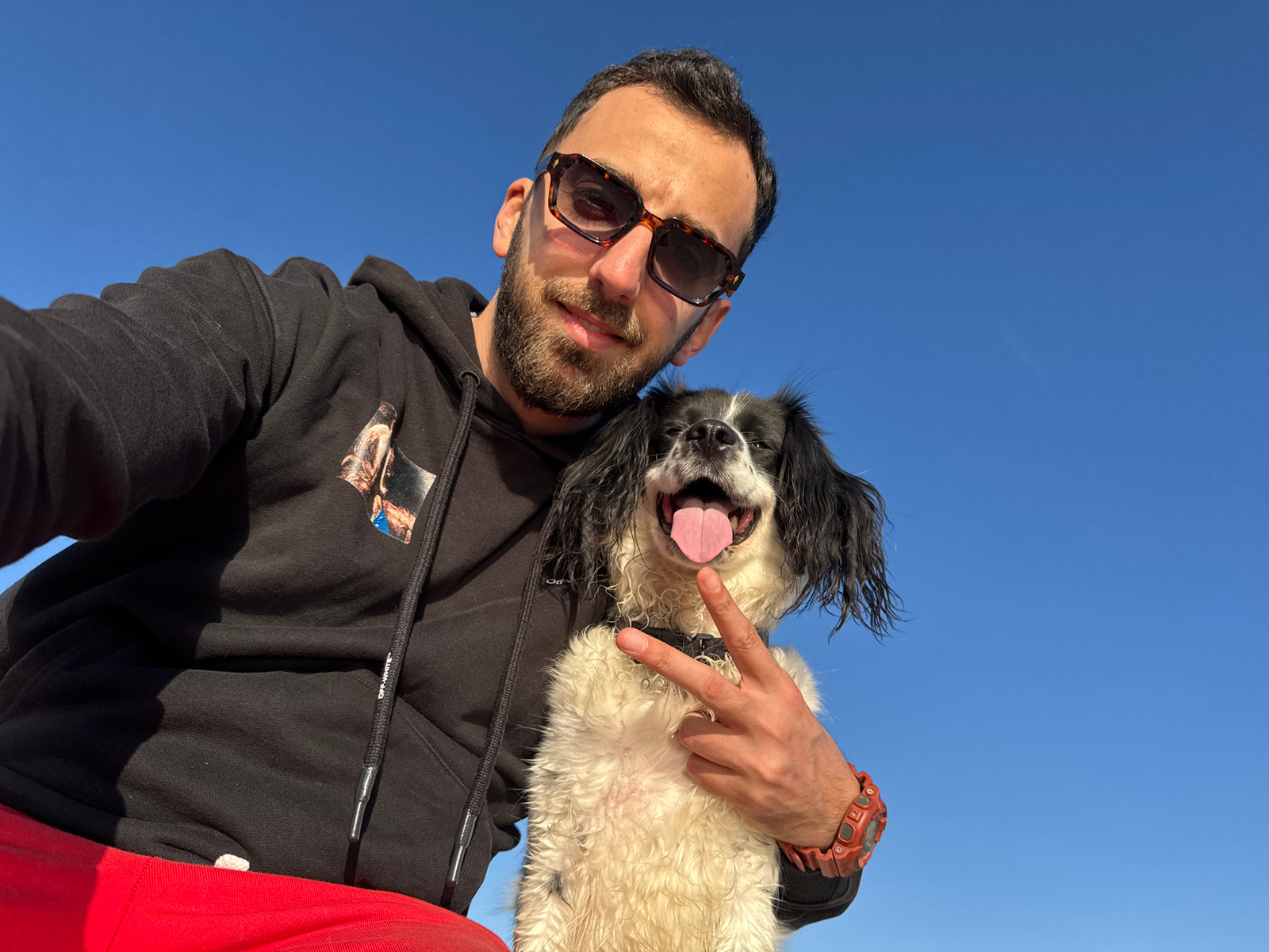 A selfie photograph, taken from a low angle, shows a man and a dog against a clear blue sky. The man, wearing sunglasses and a black hoodie, is in the foreground. Above him, the dog, a black and white…read more