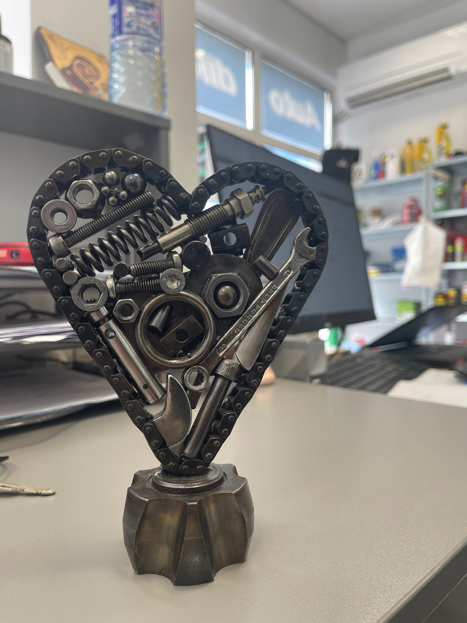 The image shows a heart-shaped sculpture made of metal parts, including chains, wrenches, nuts, bolts, and springs. It is displayed on a light gray surface, possibly a desk or shelf. The background is…read more