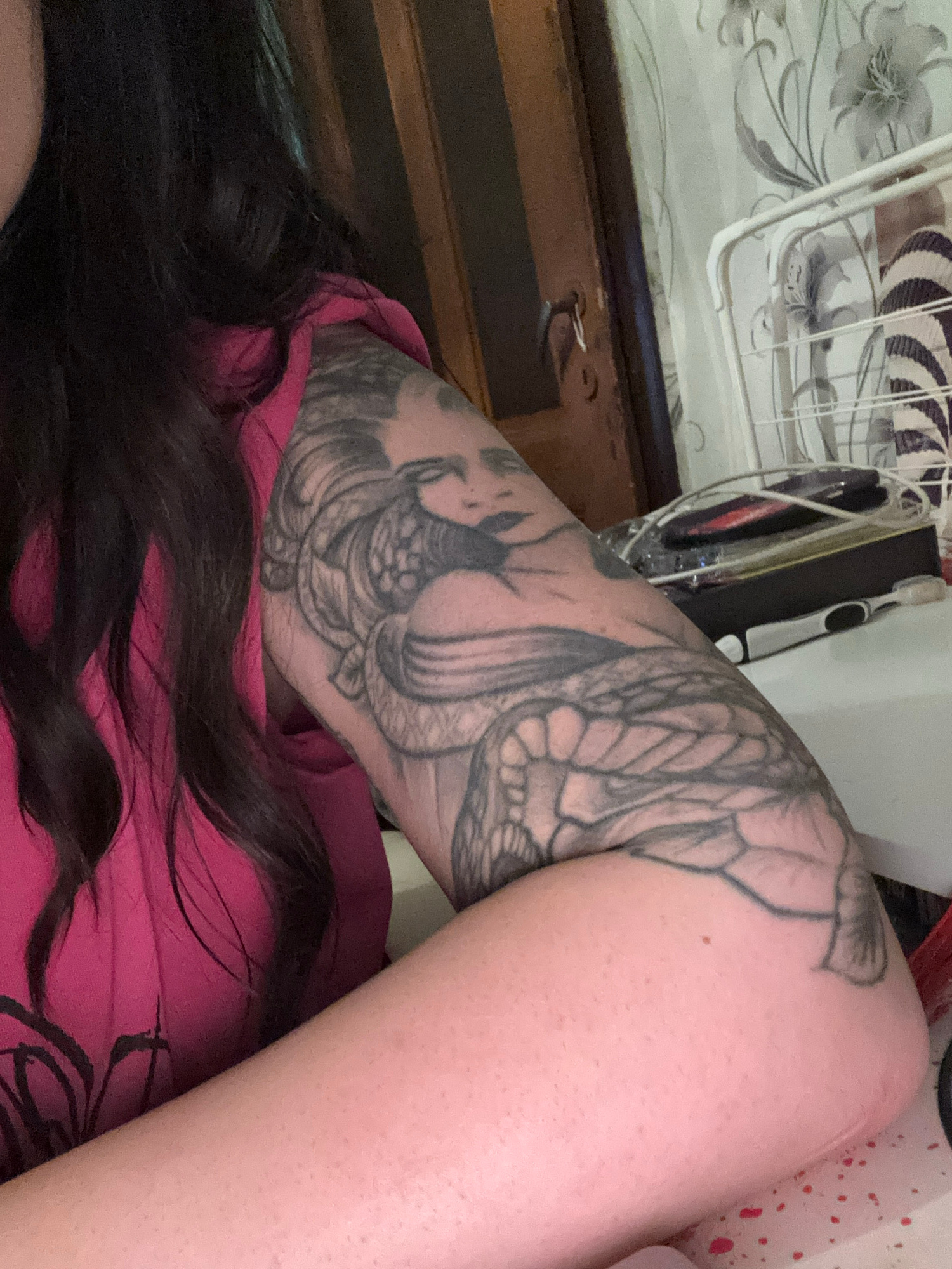A person's tattooed arm is visible in the foreground. The tattoo appears to be a detailed, dark ink design featuring organic shapes and patterns. The person is wearing a pink shirt. Long, dark hair isβ¦read more