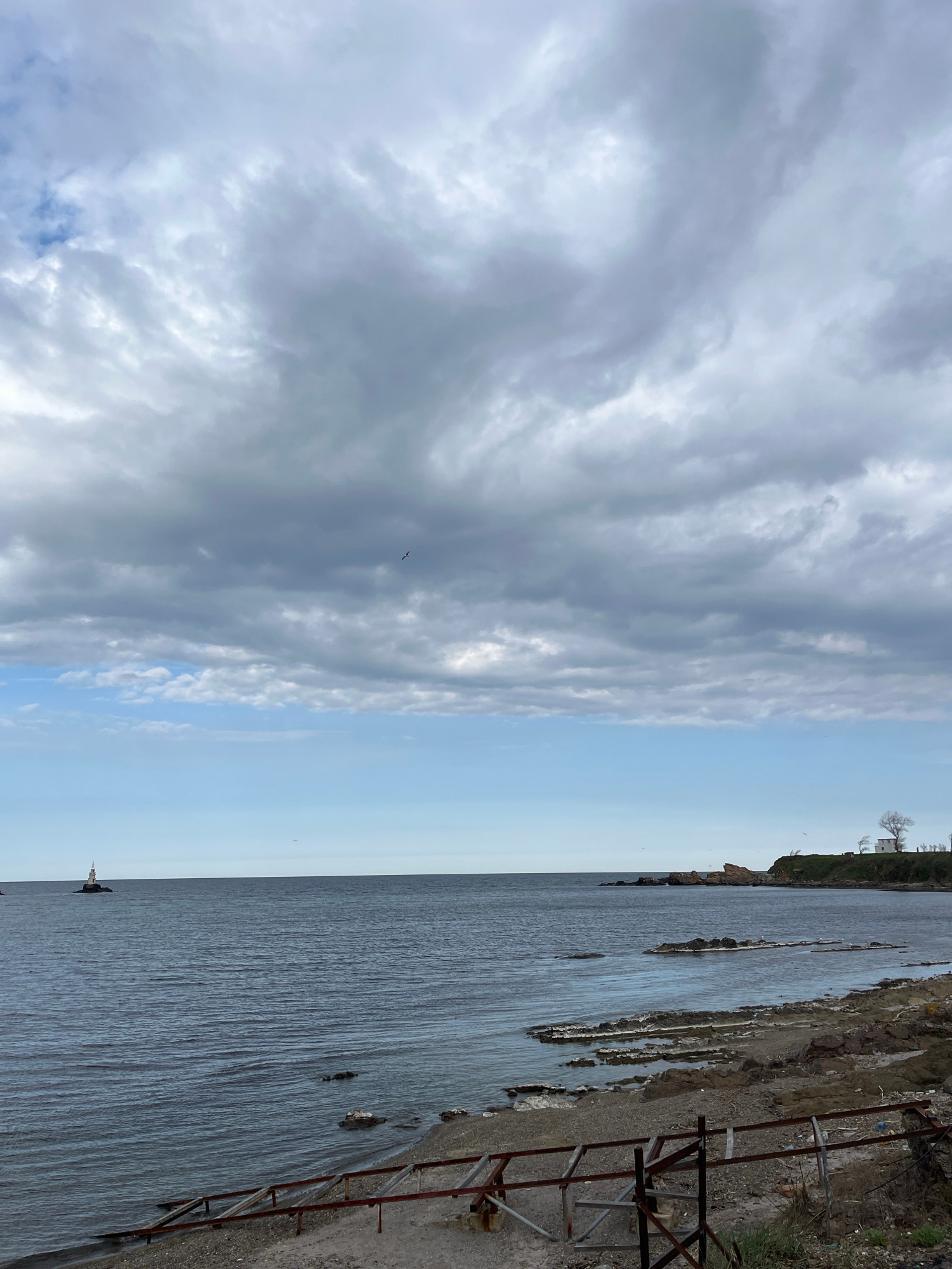 The image shows a view of the Black Sea from Ahtopol, Bulgaria. The sky is overcast with dark grey clouds covering the left half and a light blue patch on the right. A lone bird flies in the sky. In t…read more