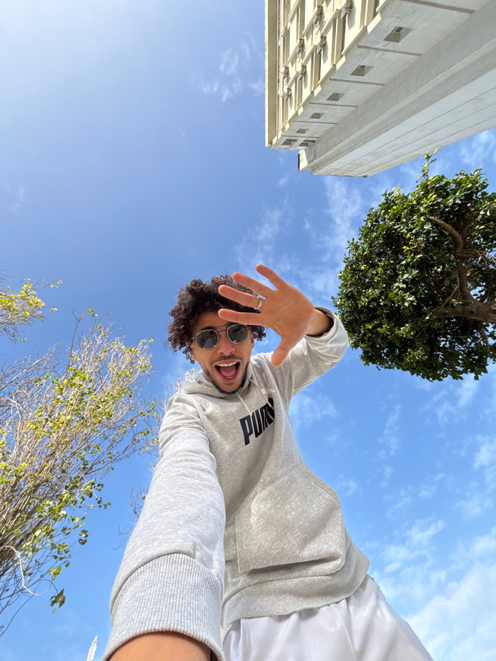 A low-angle outdoor portrait, likely a selfie, depicts a male individual with dark, curly hair and round sunglasses, positioned centrally. He wears a light grey hooded sweatshirt with a black "PUMA" l…read more