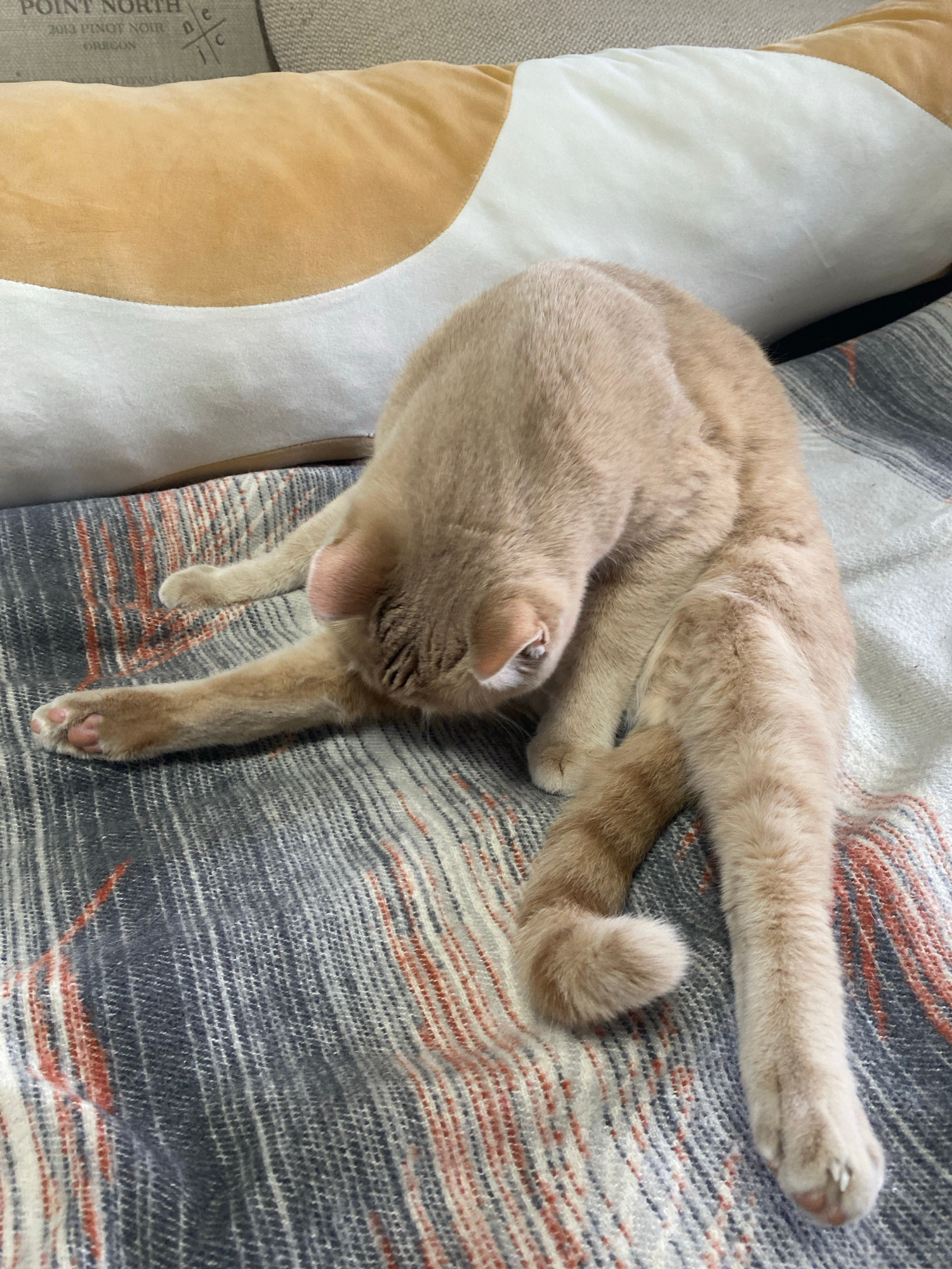 A light-colored, short-haired cat with cream or light tan fur is seen resting or stretching on a patterned blanket in an indoor setting. The cat is positioned on its side, with its body somewhat conto…read more