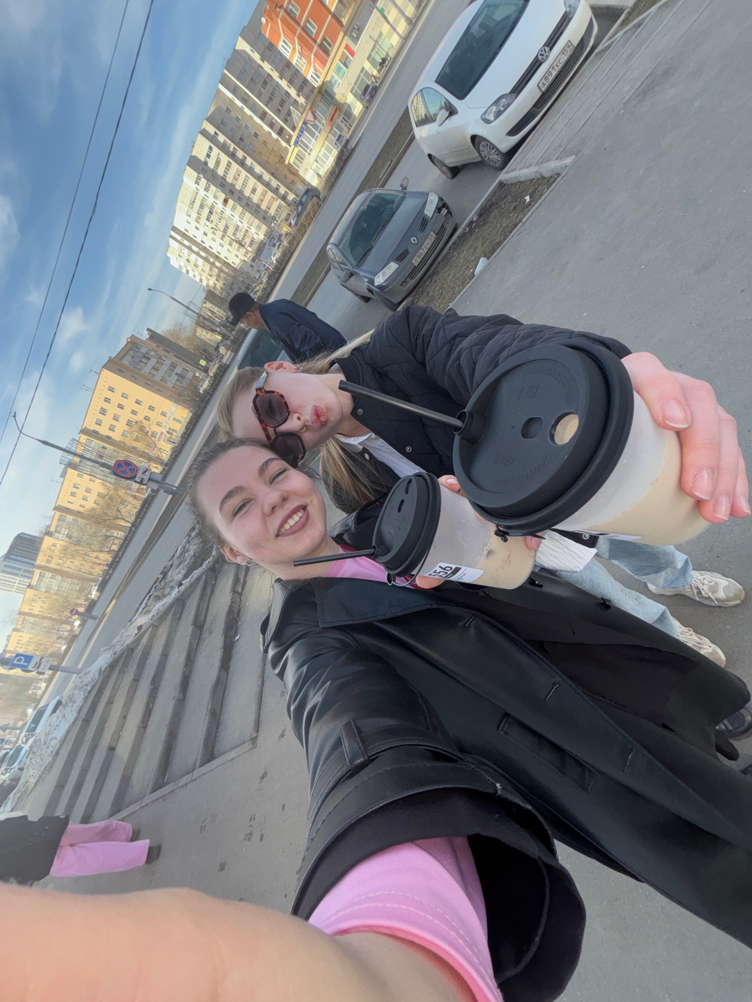 Two young women are taking a selfie while standing on a sidewalk. They are holding coffee cups with straws. The woman on the left has sunglasses on. Buildings are visible across the street, along with…read more