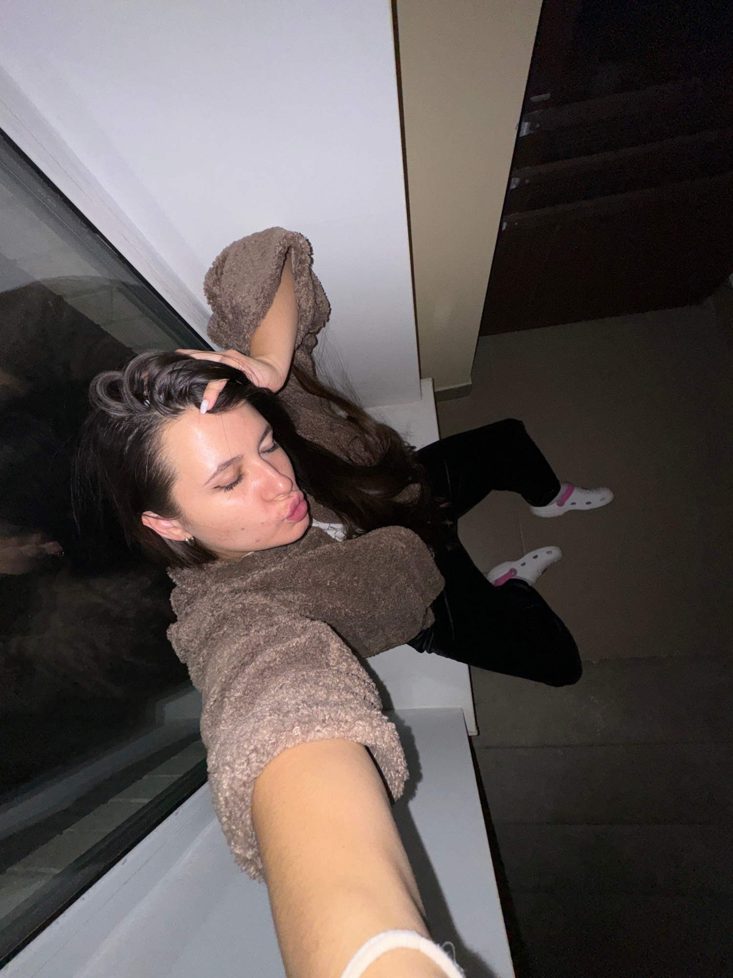 A young woman is lying on a glass surface, likely a skylight or similar architectural feature, within a building. She is wearing black pants and white socks with pink accents, and a brown, textured sw…read more