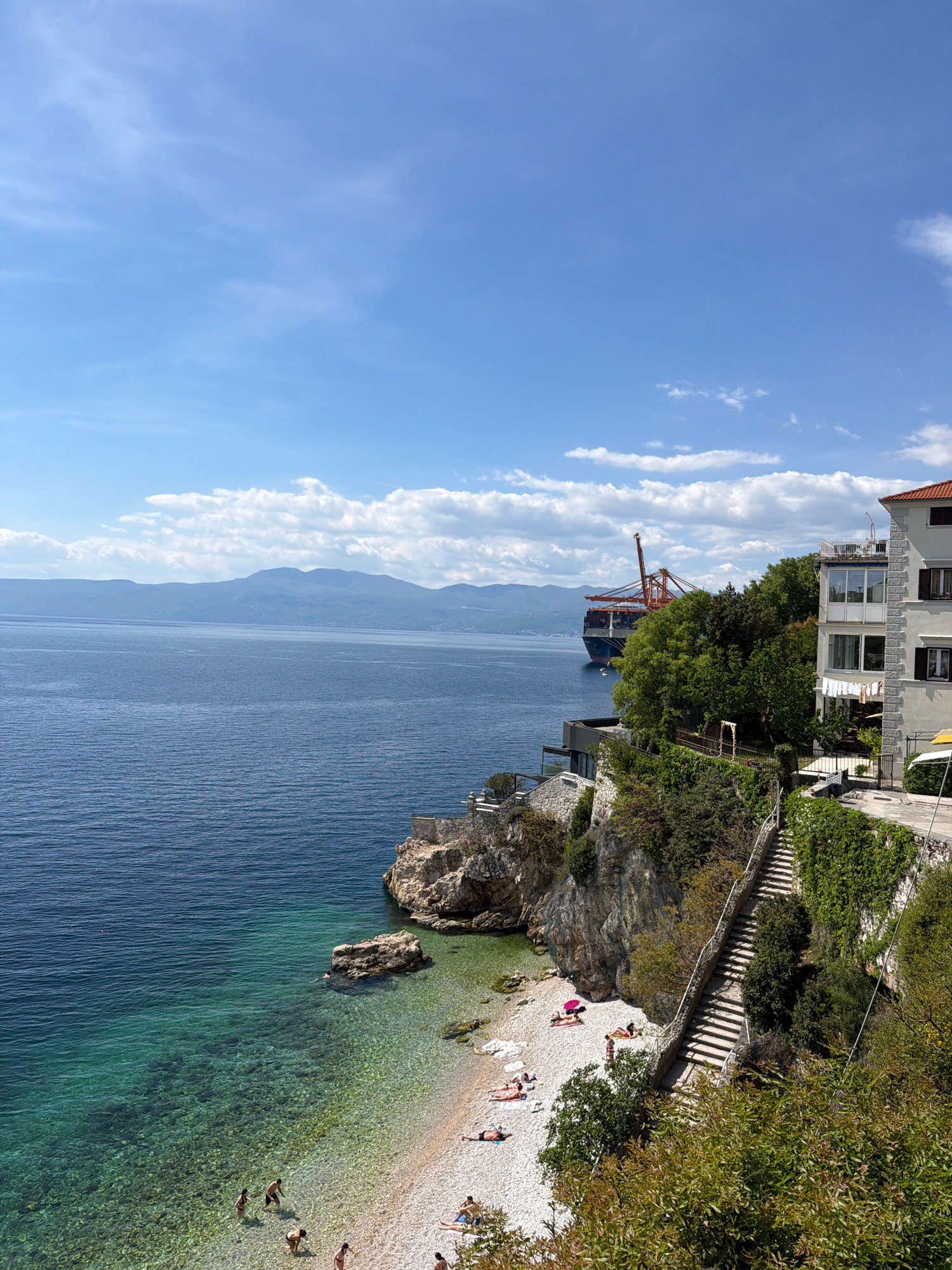 The image shows a coastal scene in Grad Rijeka, Croatia. The right side of the image features a rocky cliff with vegetation, leading to a pebble beach where several people are sunbathing and swimming.…read more