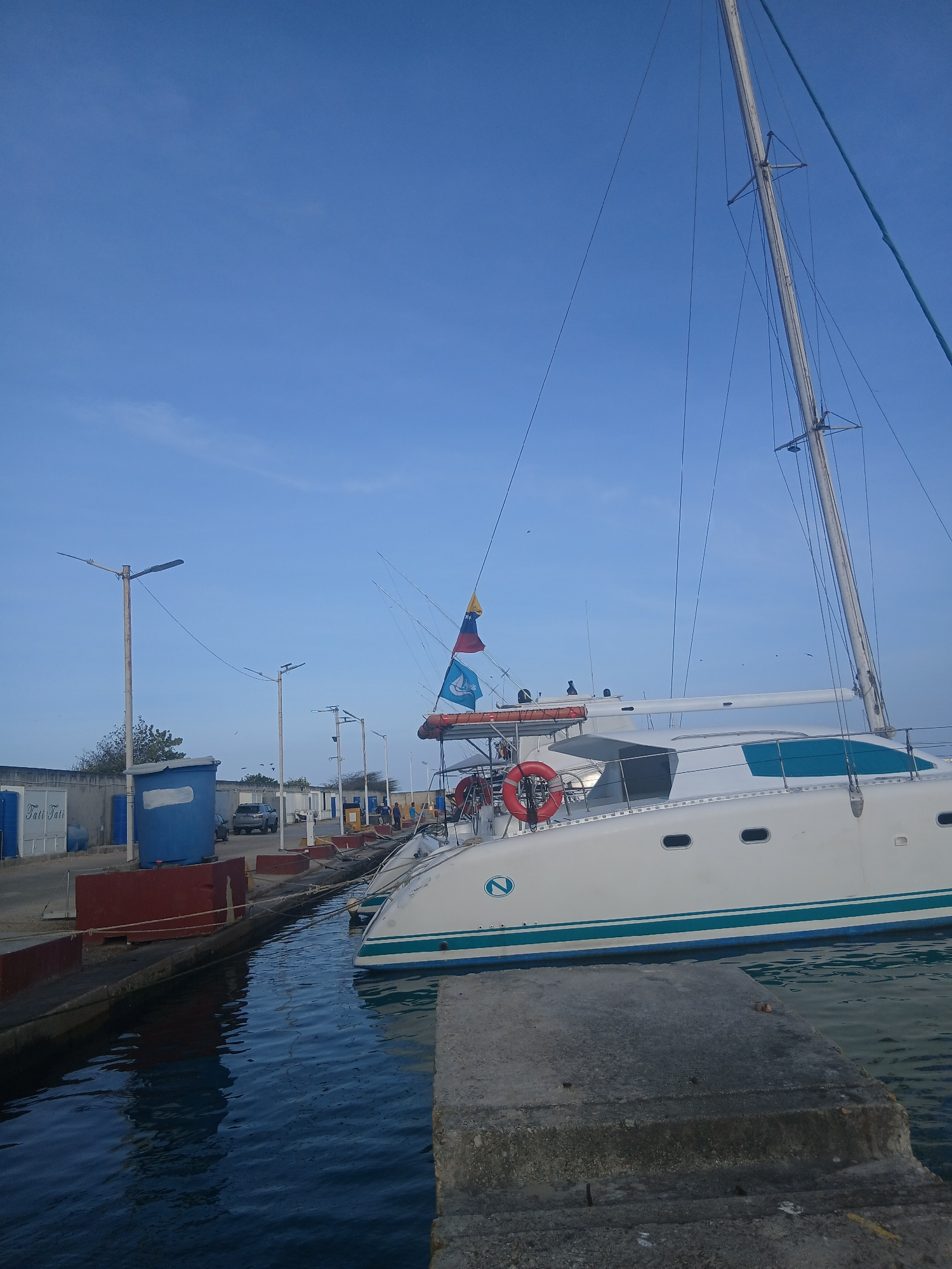 The image shows a docked sailboat in Porlamar, Venezuela. The boat is white with a blue and green stripe. There is a Venezuelan flag visible near the stern. The sky is blue. The dock is concrete. Ther…read more
