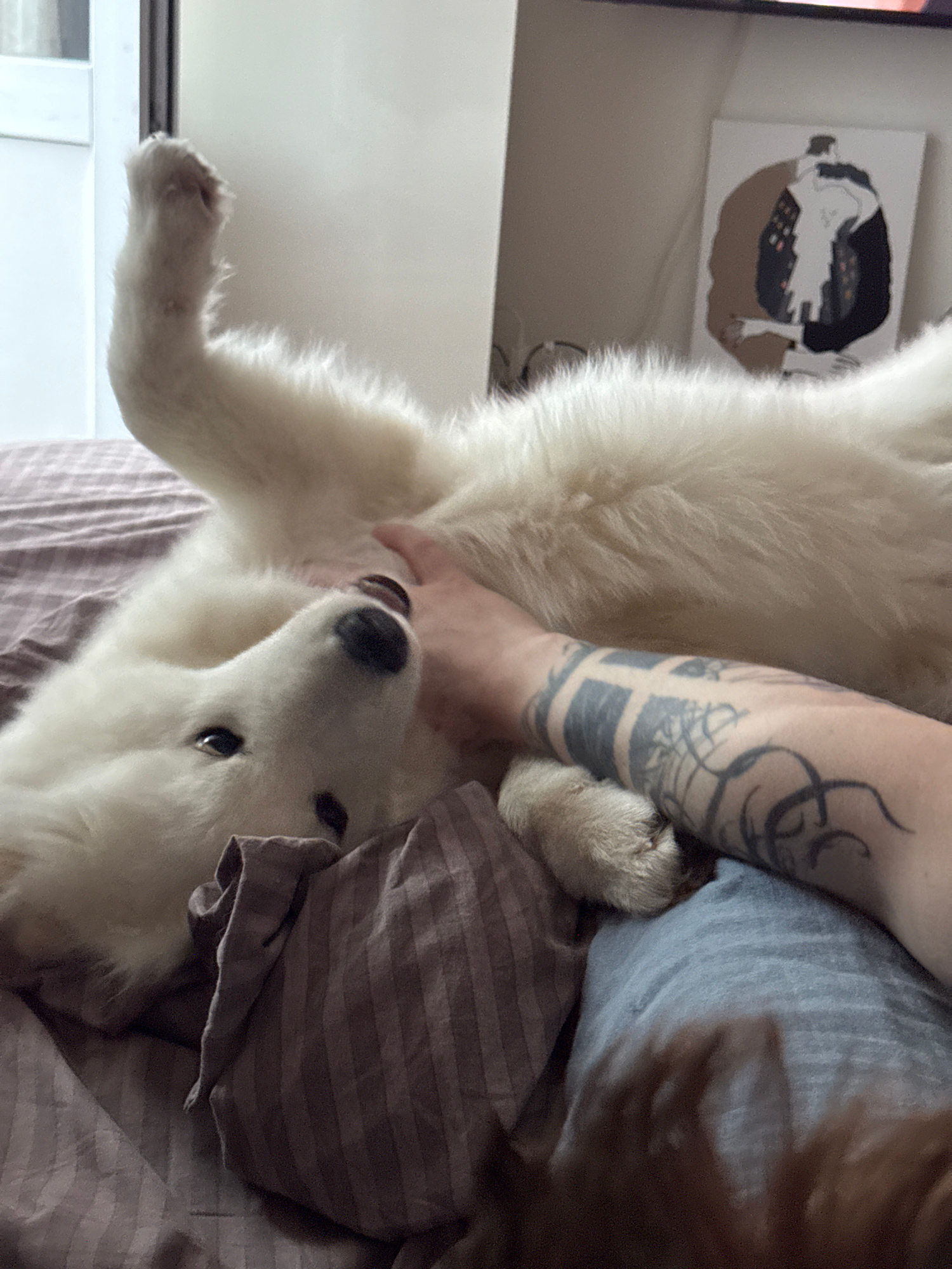 A large, white, fluffy dog lies on its back on a bed covered with a brown striped sheet. A person wearing a gray t-shirt rests an arm with prominent tattoos across the dog's chest. A brown cloth is dr…read more