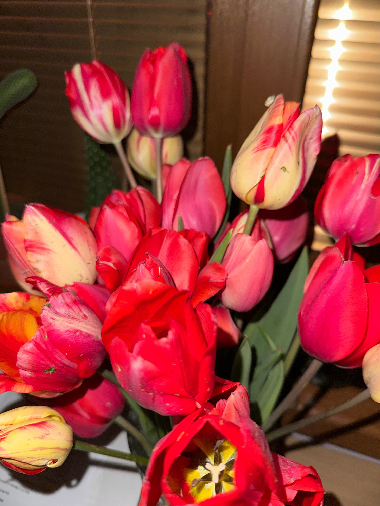 A close-up shot depicts a bouquet of tulips. The tulips vary in color, including red, pink, and red-and-white striped. One tulip is fully open, revealing yellow stamens and a white pistil. Green leave…read more