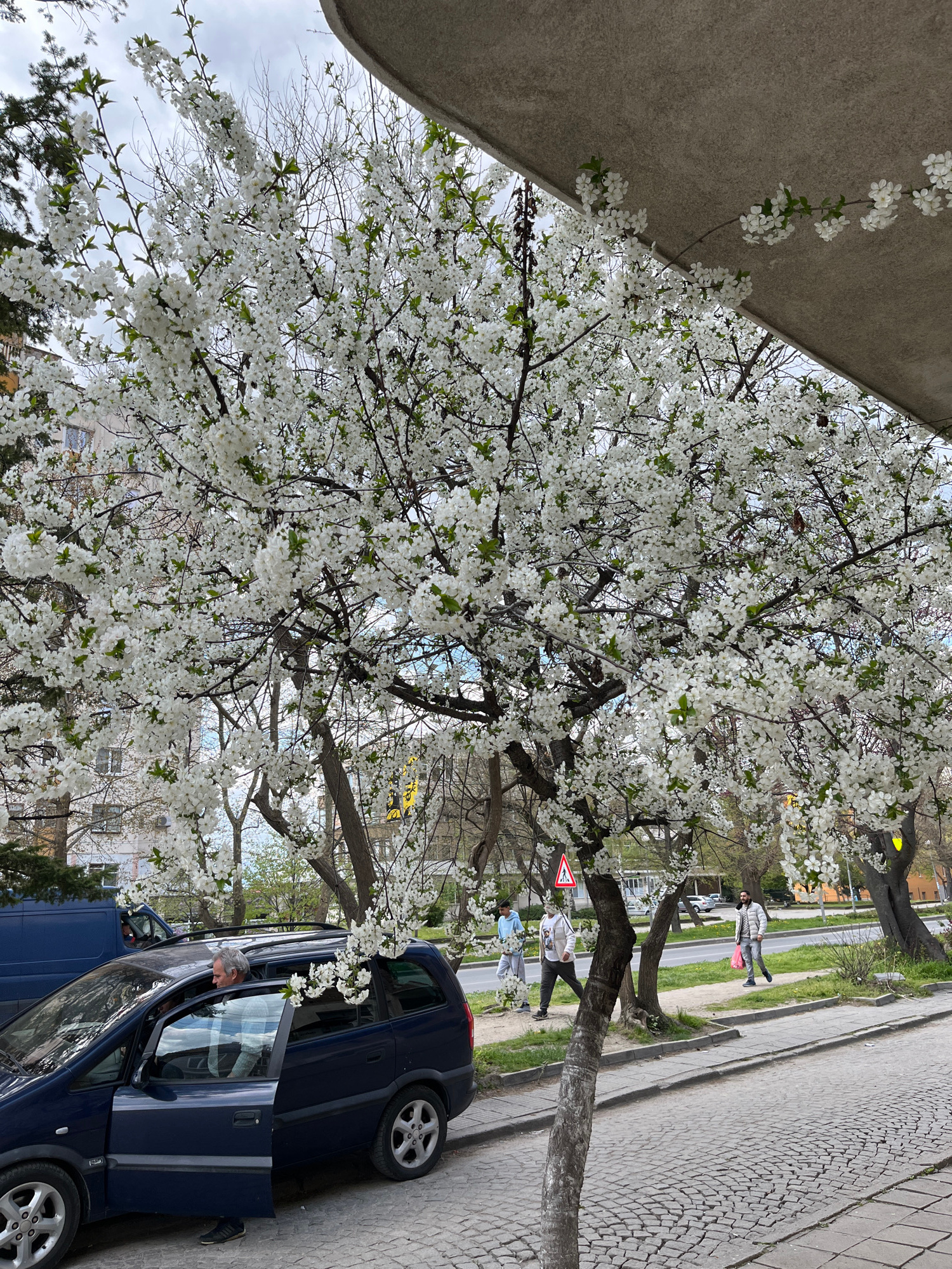 The scene is on a street in Karlovo, Bulgaria. A flowering tree with white blossoms dominates the view. A blue car with its door open is parked next to the tree; an older man is inside the car. A blue…read more