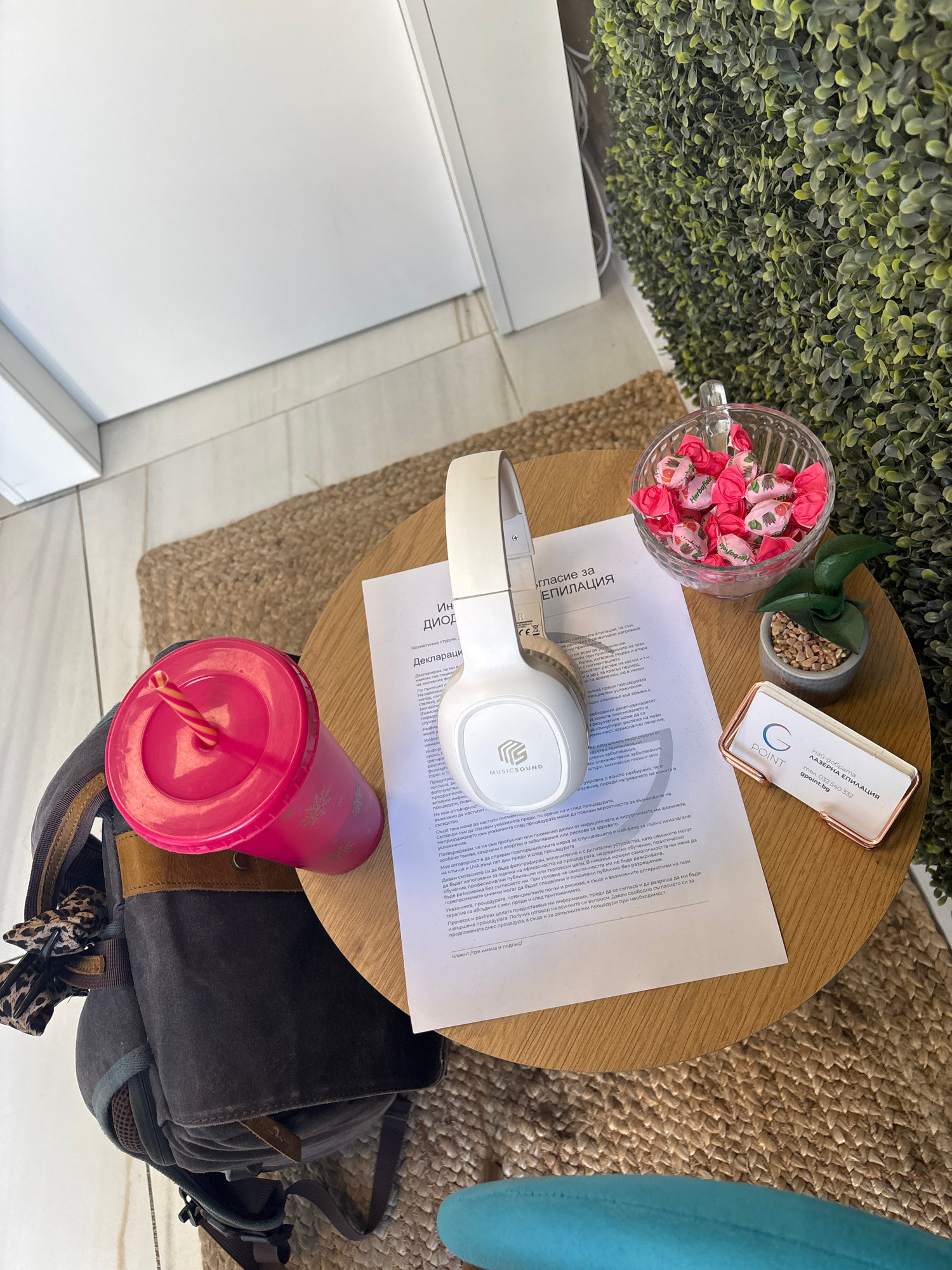 A high-angle, indoor shot captures a round, wooden table displaying an assortment of items. On the left, a glass bowl filled with pink, strawberry-flavored Herbafielda candies sits beside a small pott…read more
