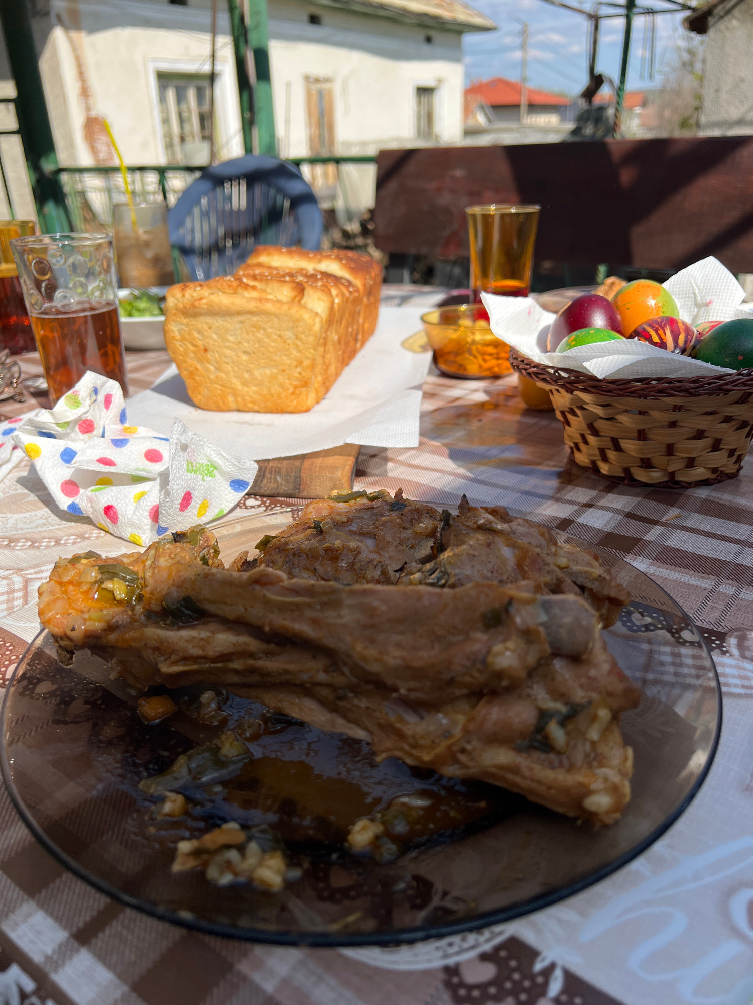 The scene appears to be an outdoor table setting in Sadovets, Bulgaria, possibly on a balcony or terrace overlooking a residential area. The table is covered with a checkered brown and white cloth. O…read more