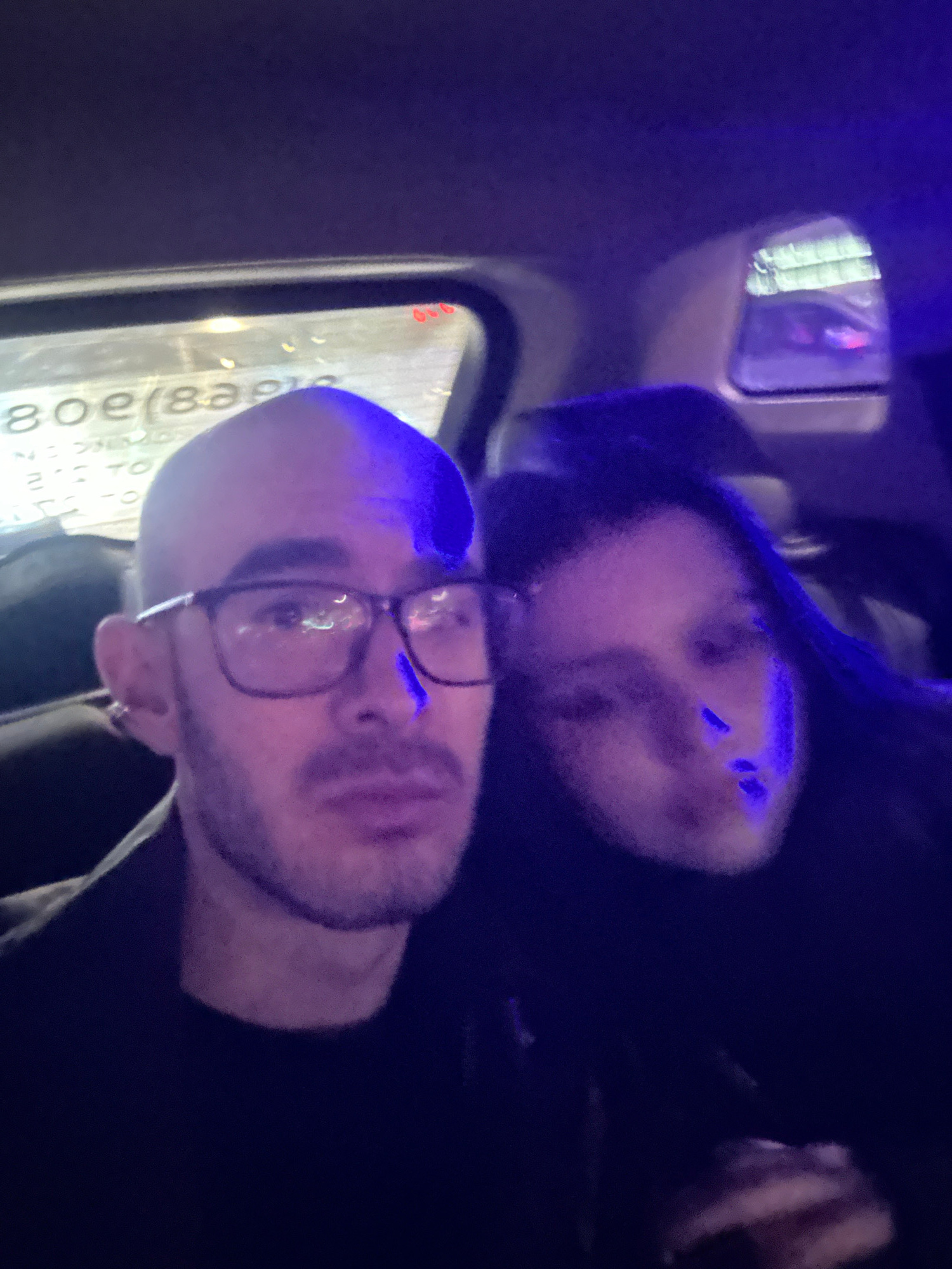 Two people are in a vehicle. One person is wearing glasses, and the other is behind. A side mirror is visible with reflections. A window is also visible with text reading "080(839". The overall lighti…read more