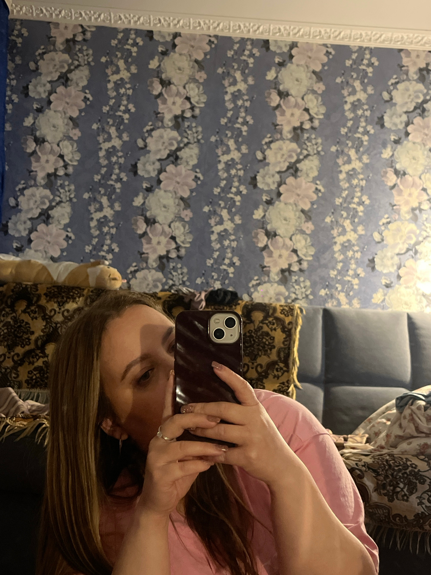 An image, oriented vertically, captures a woman taking a mirror selfie indoors. She is positioned on the right side of the frame, holding a dark-cased smartphone with a visible dual-camera module in h…read more