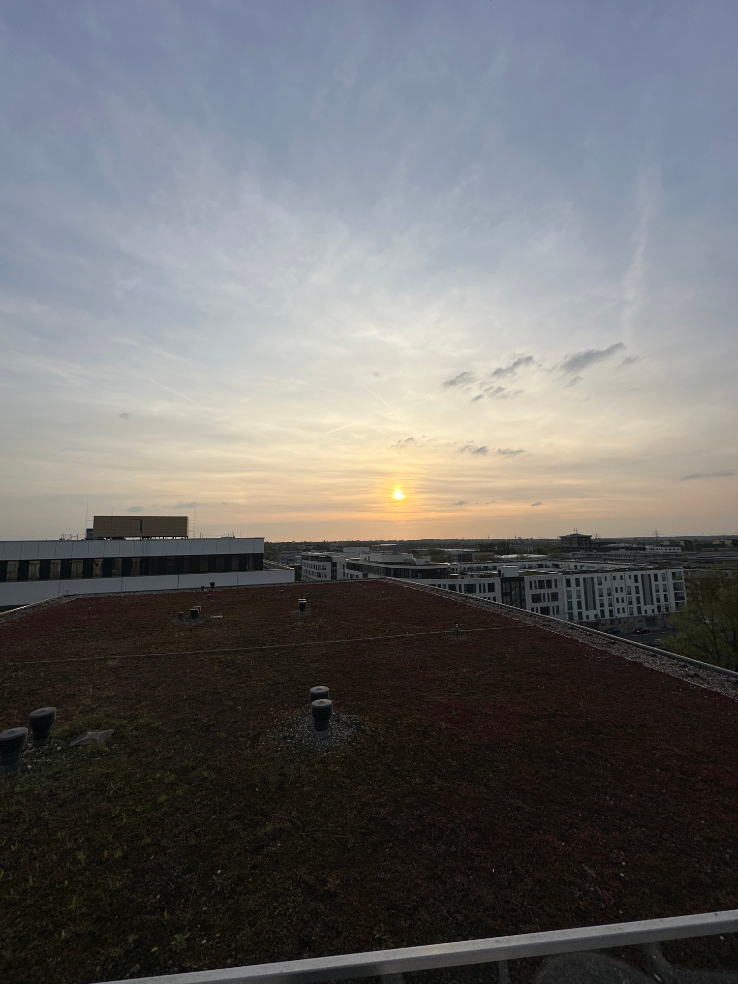 The image depicts an elevated view of a cityscape, likely taken from a rooftop in Essen, Germany. The sun is positioned near the horizon, casting a golden glow across the sky and cityscape. To the rig…read more