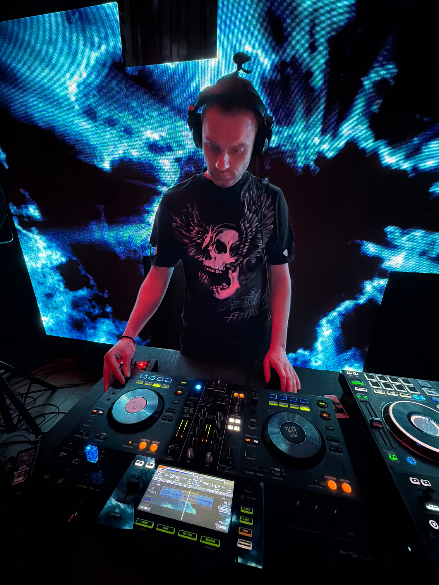 A man wearing headphones and a black t-shirt with a skull graphic is operating a DJ setup in what appears to be a nightclub or concert venue. He is facing the DJ equipment with his hands on the controβ¦read more