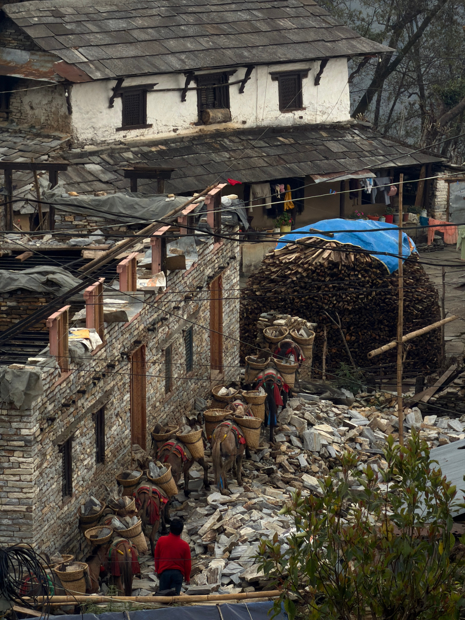 This image depicts a tiered, sloping village environment in Purano Ghandruk, Nepal, under an overcast sky. In the upper background, a traditional Nepalese house with a white facade, dark wooden windowβ¦read more