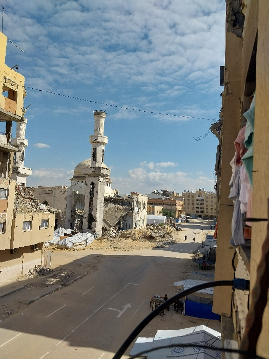 An elevated view captures an urban scene of extensive destruction in Khan Yunis, Palestinian Territory, under a blue sky with scattered white clouds. The central focus is a heavily damaged mosque feat…read more
