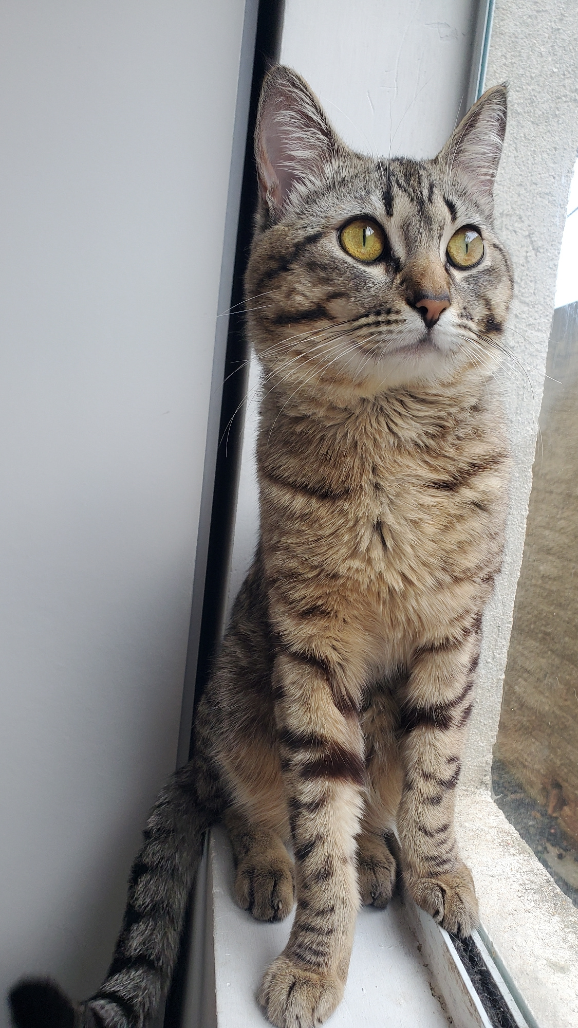 A tabby cat lies upside down on a white surface, possibly a windowsill or shelf, indoors. The cat's body is oriented horizontally across the frame, with its head tilted up towards the upper left corne…read more